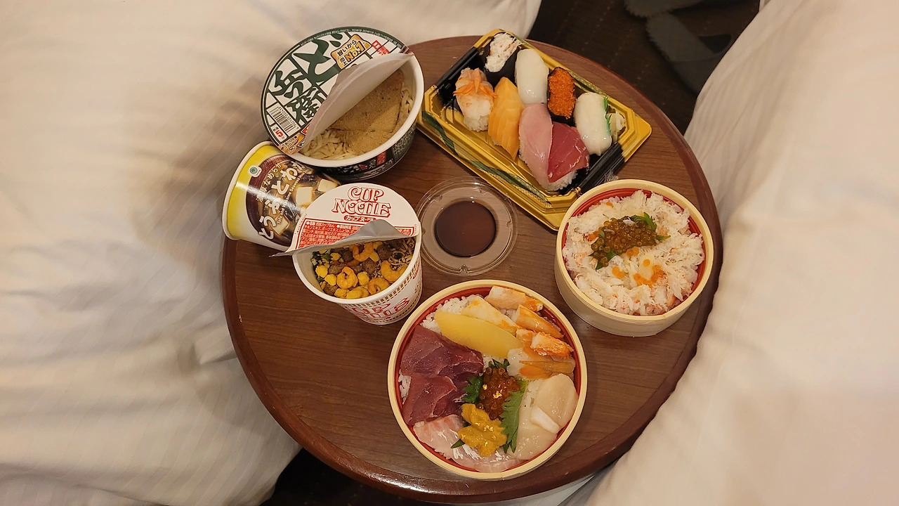마지막으로 저녁밥은 식당 말고 포장해서 호텔로 돌아가기로 했다. 지하 식품 코너 두 군데를 돌아서 괜찮은 초밥과 컵라면을 사서 호텔로 돌아갔다.