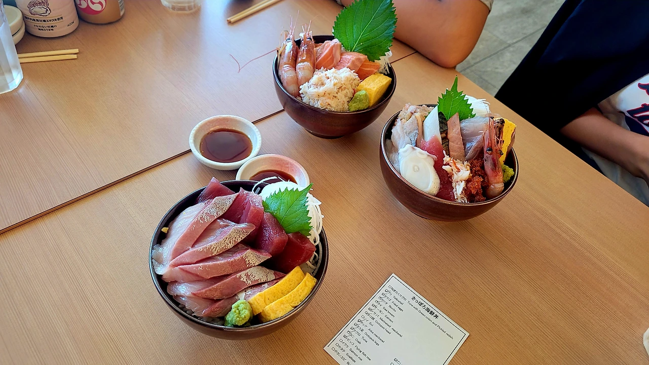 정오가 다 되어서 숙소 근처 식당에서 밥을 먹기로 했다. 엄마가 간단하게 구글맵에서 찾은 식당이다. 각자 먹고 싶은 카이센동을 시켰다. 나는 회를 좋아해서 먹고 싶은 게 딱 하나 카이센동이었다. 여러 맛집을 찾아봤는데 가격이 저렴하진 않았는데 여기는 점심 특선이라 좀 저렴한 가격인 것 같아서 주문했다. 아들은 자기가 먹고 싶은 게, 연어, 새우만 올라간 회덮밥을 먹었다. 남편은 생선회 두 종류 말로 된 회덮밥을 먹었다. 점원이 음식을 서빙하면서 무슨 종류의 회가 있는지 하나하나 설명해 줬다. 회가 살살 녹는 게 역시 본토의 맛이었다. 다들 맛있게 먹었다.