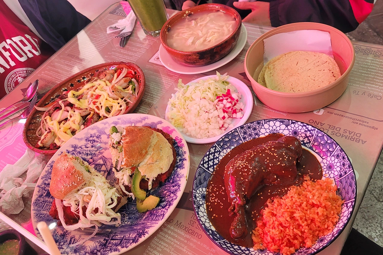 점심이 되어 근처 평점이 좋은 식당을 찾았다. 멕시코 음식을 공부한 남편이 새로운 멕시코 음식을 여러 가지를 시켰다. 이곳이 멕시코 고추창인 '몰레'의 고장이라 몰레 닭고기, 멕시코식 햄버거를 주문하고 나는 포솔레에 다시 도전했다. 내가 시킨 포솔레는 닭곰탕에 옥수수알을 넣고 끓인 맛이었다. 고춧가루를 넣어서 맵게 해서 먹었는데, 보기보다 가루가 매워서 적은 양에도 국물이 많이 매워졌다. 옥수수알이 크고 단단해서 끓였는데도 씹는 맛이 있었다. 포솔레를 다 먹고 나서 튀긴 또띠야에 아보카도와 살사소스를 올려놓고 먹었다. 삼일 내내 먹던 타코에서 벗어난 것만으로도 큰 의미가 있었다.