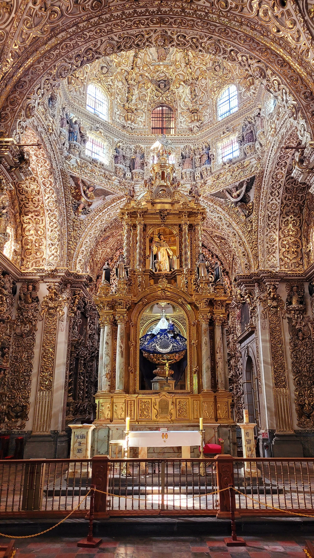 푸에블라 터미널에서 우버를 타고 구도심지를 향해 달리기 시작했다. 푸에블라 시내 '산토 도밍고 성당(Templo de Santo Domingo)에 도착했다. 성당 안으로 들어가니 화려한 성당 제대가 보이고 더 안으로 들어가니 푸에블라 여행의 하이라이트라는 로사리오 황금 예배당이 나왔다. 제단을 비롯 벽 천장까지 황금박으로 도배되어 화려함의 극치였다. 창문으로 들어온 빛과 어울려 황금빛의 실내가 눈이 부시게 빛났다. 이건 마치 신의 영광의 영광을 눈에 보이게 한 것 같았다. 금박을 모으며 정성을 올렸을 푸에블라 사람들의 집념이 대단했다. 예배당에서 나와 재단으로 가니 수도회 성인들의 부조가 있었다. 검색해 보니 도미니크 수도회 성인들은 영리하고 다방면의 지식이 풍부했다고 한다. 그래서 공부를 잘하게 해달라고 기도를 하러 많이 온다고 한다. 아들이 그 말을 듣고 자기도 공부 잘하게 해달라고 진지한 기도를 올렸다.