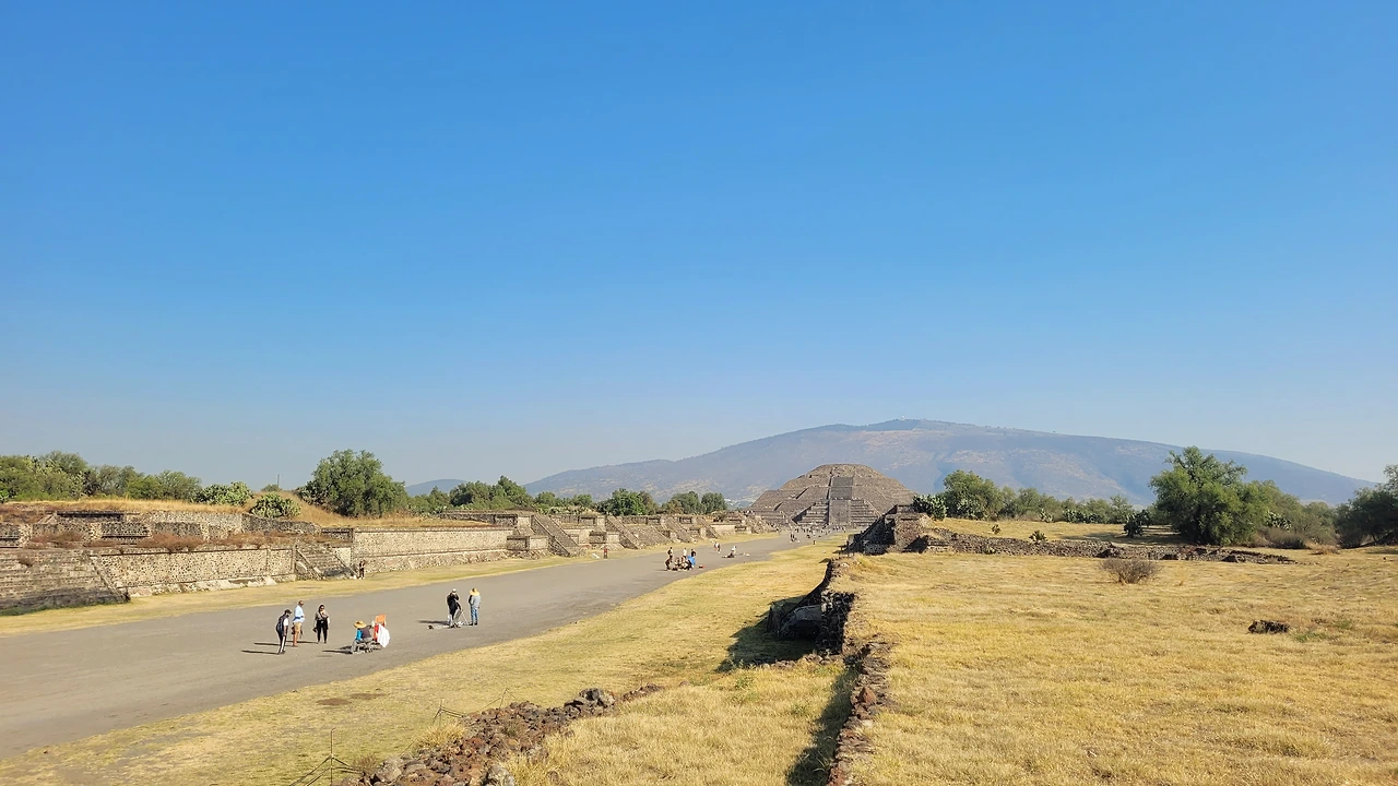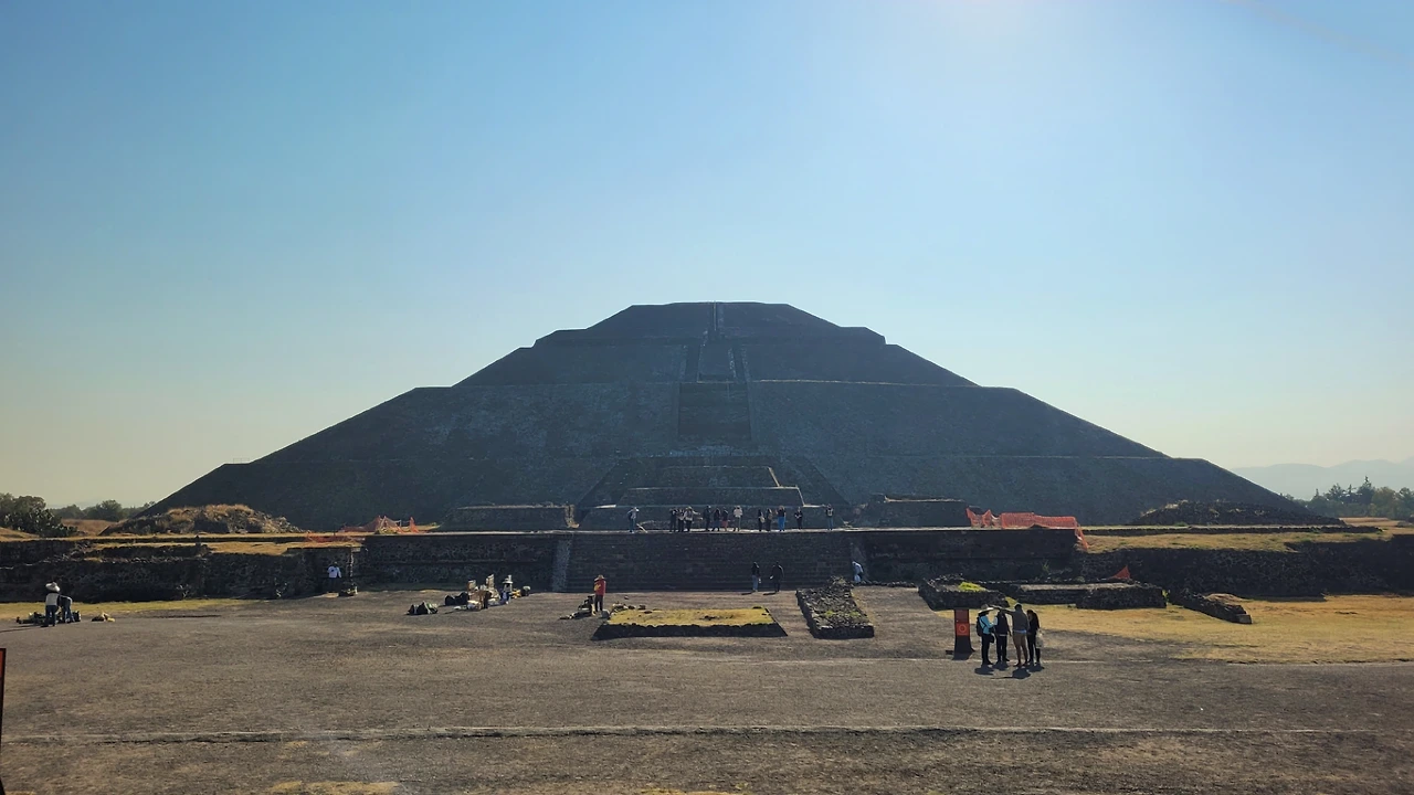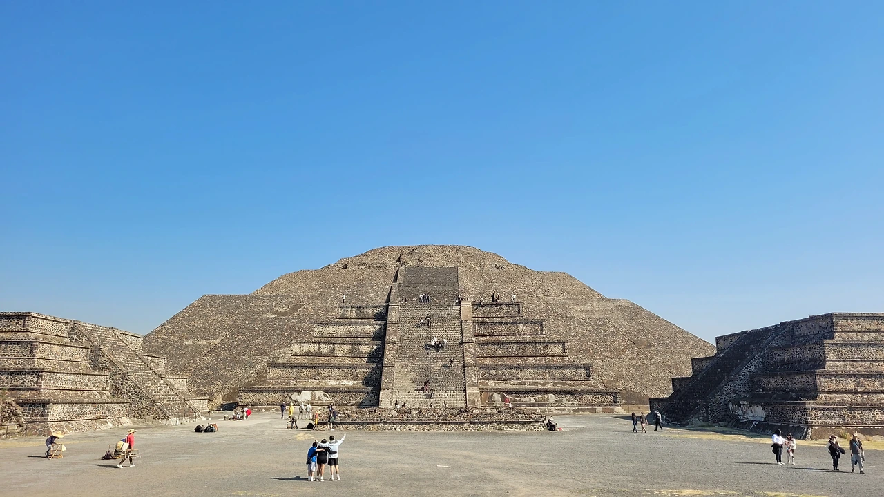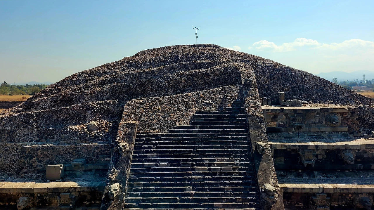 그렇게 북쪽 끝인 달의 피라미드(Piramide de la Luna)에 도착하였다. 태양 피라미드보다 작은 규모지만 테오티우아칸의 주요 의례들이 이곳에서 진행되었다. 여기는 일부 올라갈 수 있어서 올라가기 시작했다. 계단이 매우 가팔라서 너도 나도 네발로 짚고 겨우 올라갈 수 있었다. 올라가보니 아래에 테오티우아칸 전체와 그 뒤로 너른 땅이 펼쳐져 있었다. 고개를 들어보니 땅보다 더 넓은 하늘 아래 구름 하나 없이 거대한 태양이 강렬하게 빛나고 있었다. 태양의 기운을 제대로 받는 곳이 맞았다. 그 시절 고위관리 또는 제물이나 되어야 볼 풍경이겠다 싶어 오랜 시간 바라봤다. 대신 그늘도 없는 곳이라 해가 솟아오를수록 빠르게 더워져서 피라미드를 내려왔다. 달의 피라미드는 인간의 심장과 피를 바쳤던 제사의식이 주관됐던 곳으로 추정되고 있다.