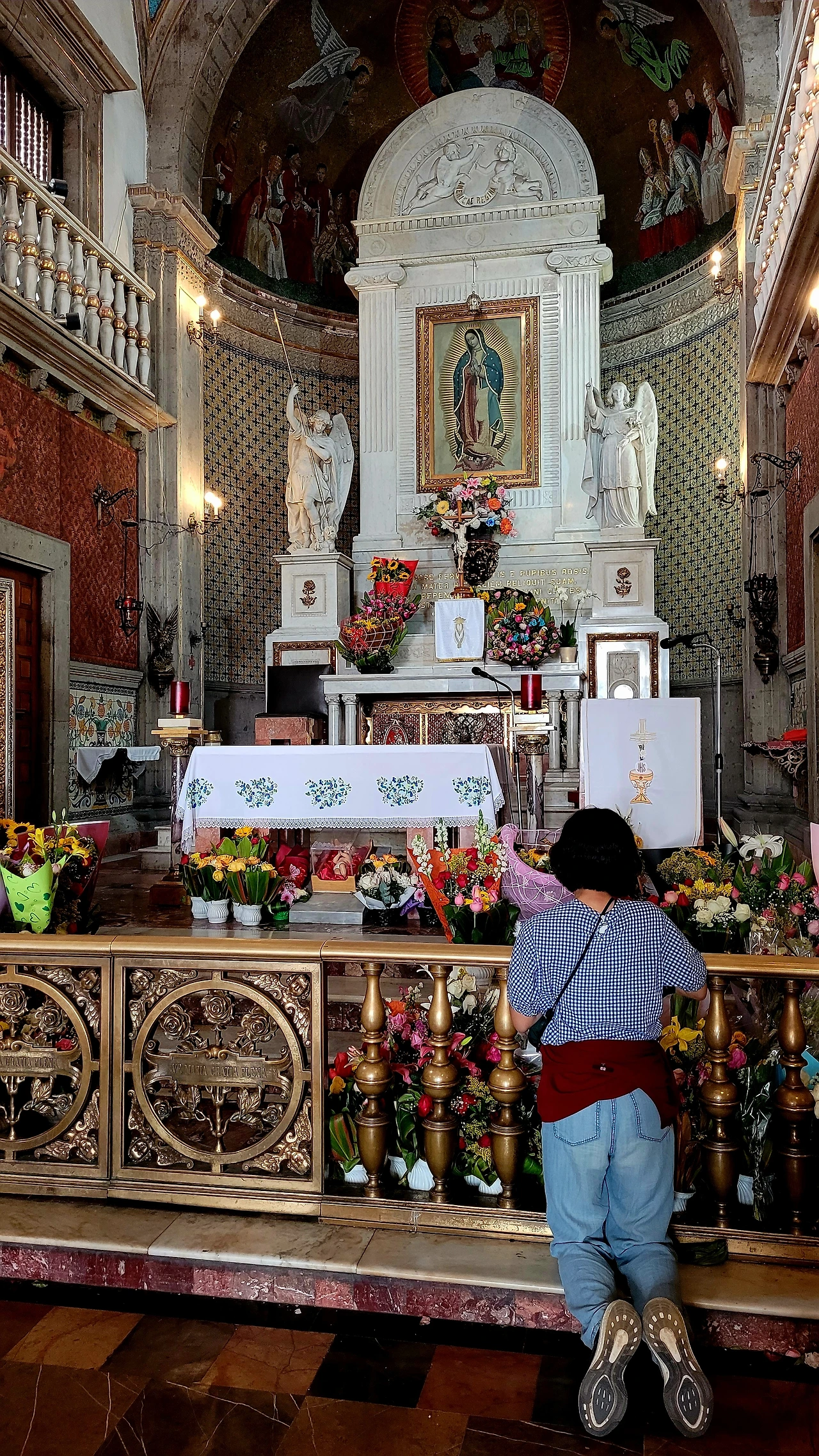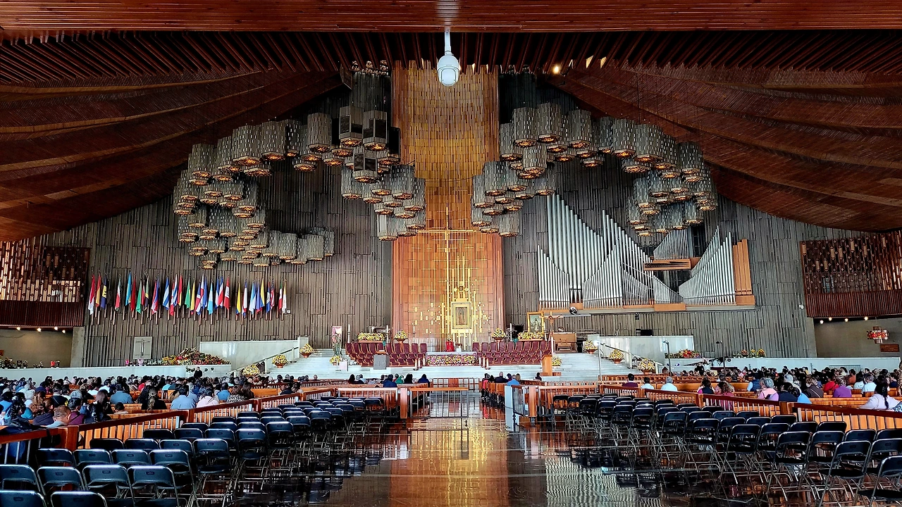 식사를 마치고 과달루페 성지안으로 들어섰다. 과달루페 성지는 세계 3대 성모 발현지 중 하나로, 1531년 인디오 원주민이었던 성 후안 디에고에게 성모님이 나타나신 곳이다. 넓은 광장에 사람들이 가득하고 마침 2시 정각이 되자 천사의 종소리 같은 소리가 울리더니 오토마타로 성모님 발현 인형극이 나왔다. 성모님 성우 목소리가 참 따뜻했다. 이어서 대성전으로 서둘러 갔다. 성전 입구에는 "내가 너의 어머니가 아니냐? (¿No estoy yo aquí, que soy tu madre?)" 하신 성모님의 말씀이 세겨져 있었다. 아까 들려온 따뜻한 목소리가 이 내용인 듯 했다.