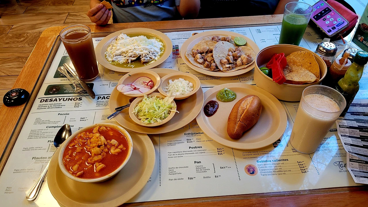 하루 종일 제대로 먹지 못해 배가 고팠다. 숙소 직원이 추천해 준 식당으로 향했다. 타코, 포솔레, 엔칠라다 등 우리가 아는 멕시코 요리를 주문했다. 먼저 튀긴 또르띠야와 라임이 기본 반찬처럼 나왔고, 이어서 주문한 메뉴가 차례로 나왔다. 돼지머리 고기를 넣은 타코는 생각보다 느끼했고, 또르띠야에서 내용물이 자꾸 흘러 먹기가 쉽지 않았다. 기대가 컸던 탓인지 맛은 평이하게 느껴졌다.