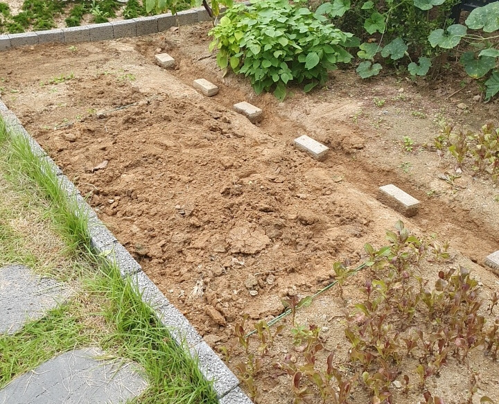 집을 지을 때 마당 한쪽에 텃밭을 잡아놨다. 같이 사는 시어머니나 나나 텃밭을 가꿔본 적은 없지만 땅이 있으니 놀리지 말고, 가볍게 채소나 키워서 먹자 하는 데 마음이 모였다. 주차장을 깔고 남은 투수 블럭으로 텃밭의 경계를 박고, 가운데 물이 빠져나올 도랑을 파니, 꽤 그럴듯한 텃밭의 모양새를 갖췄다. 어머니께서 농사짓는 친구에게서 듣고 거름을 미리 뿌려놓아야 한다고 하셔서, 거름 두 포대를 인터넷으로 주문해서 텃밭에 쏟고 삽으로 흙과 잘 섞어 놓았다. 그리고 따뜻한 5월이 되어 두근거리는 마음으로 시장을 찾았다.