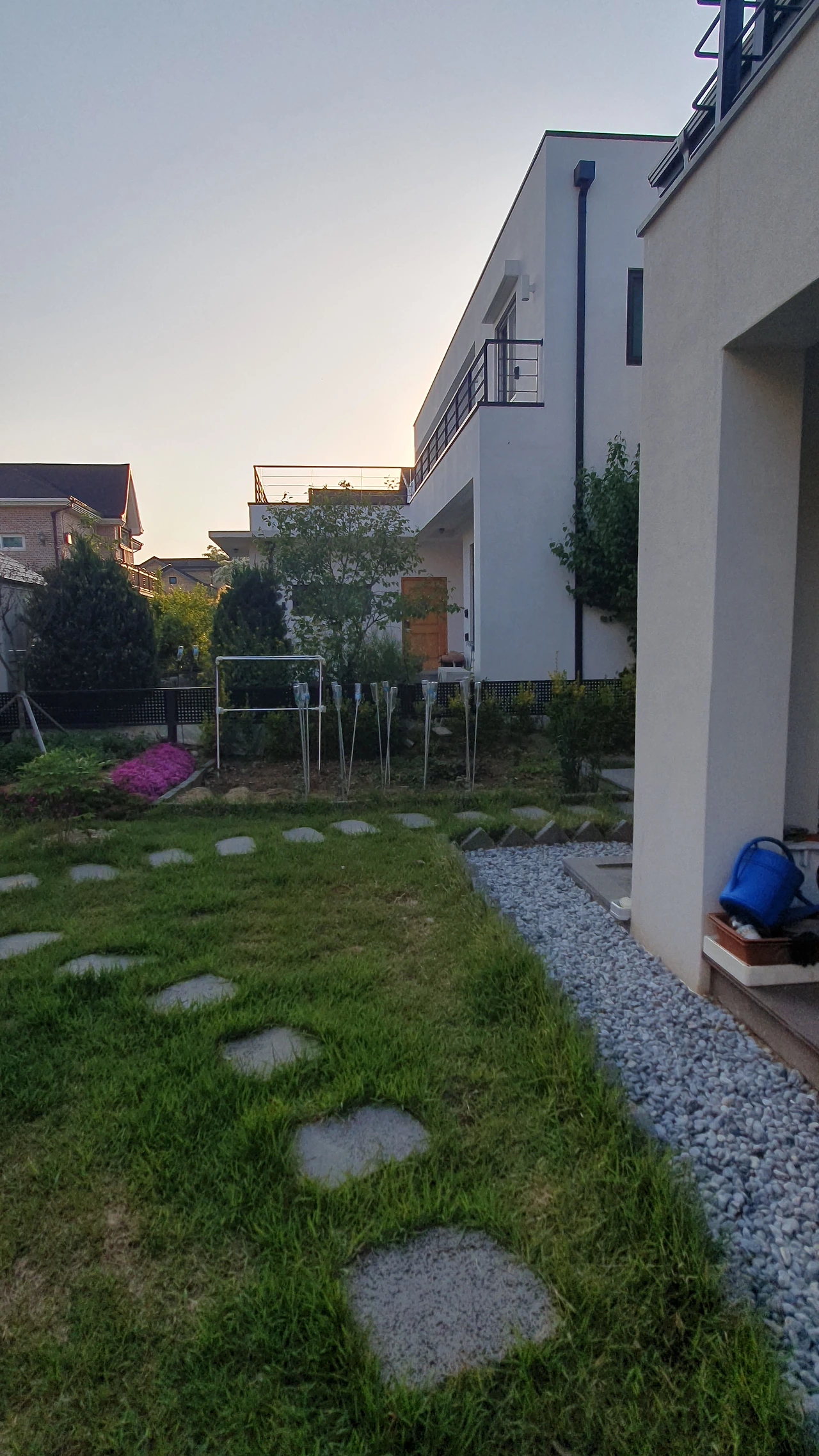 그리고 살아보니 이런 입지의 가장 큰 장점은 마당이 외부와 완벽히 차단된 환경이라는 점이다. 마당이 중정의 형태를 띄게 된다. 나는 밖에 나가면 기가 빨리는 MBTI의 I타입의 사람인데, 우리 집 마당에 나갔다 오면 이상하게 밖에 나간다는 생각이 안들었다. 마당에 나가 꽃 구경을 하거나 밭일을 하면 밖에 나왔는 데도 집에 있는 것 같은 편안함이 있다. 그 이유를 생각해보니 사방 앞 옆으로 집들이 든든히 둘러 주고 있어서 지나가는 사람이 소리를 내거나 쳐다봐서 나의 휴식을 방해할 확률이 아예 없다. 이런 장점때문에 1층에 사시는 어머니는 자주 1층 데크에 나와서 다리를 편안하게 올려놓고 밖을 쳐다보면서 힐링을 하신다. 집 밖에 나왔을 때 혹시나 누구를 마주쳐도 모두 아는 얼굴인 이웃집 주민이다. 지나가는 사람이 집을 볼 수 없다는 게 나와 어머니에게는 장점이다. 차단된 환경에서 편안함을 느끼는 사람이라면 열려있는데 닫혀있는 끼인 입지를 추천해주고 싶다.