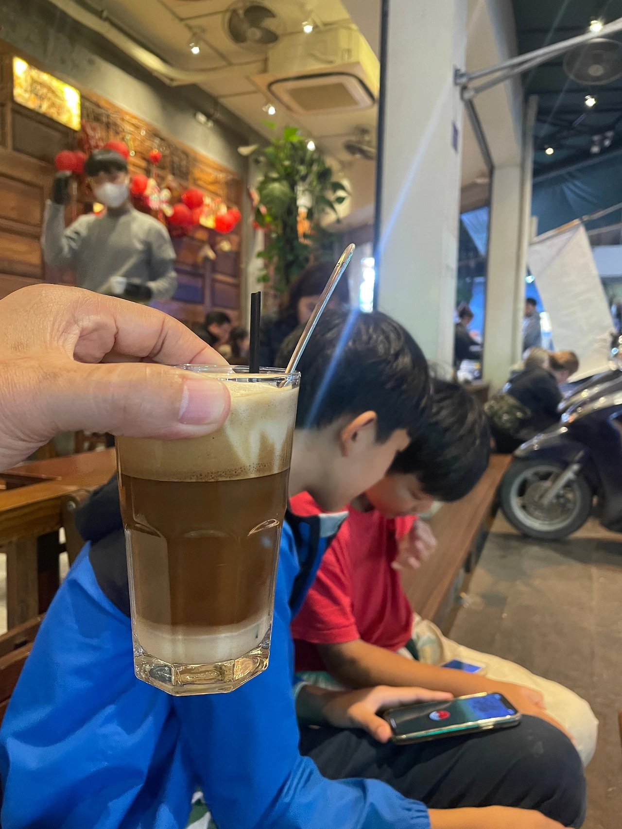 사원을 둘러보고 마지막으로 하고 싶다는 시클로 탑승을 하기 위해 사원 앞 시클로 기사와 흥정을 한다. 구글링으로 영어로 검색하니 한 시간에 100,000-150,000동으로 나오길래 30분에 얼마냐고 물으니 150,000동을 부른다. 100,000동을 마지노 선으로 협상을 하는데 두 명의 시클로 기사가 겹쳐 서로 흥정을 이어가다 한 사람이 100,000동을 콜 해서 타기로 했는데, 한 사람이 120,000동으로 계속 따라붙는 사이 둘째가 100,000동 시클로에 타고 왜 안타냐고 울고 있어 그리로 탔다. 셋이서 타고 가는데 120,000동 시클로 기사가 붙어 자기 걸 타라고 하고, 먼저탄 기사도 한 명은 저라로 타라고 하고~. 하~~ 이런 짜증 나는 상황이 도를 넘어 애들에게 내리라고 하고 빠져나왔다. 애들에겐 그래도 타 봤으니 됐다고 하는데, 한 사람이 계속 따라붙어 빨리 장소를 피해 카페에서 커피 한잔과 10원 빵 하나씩 먹으며 짜증을 달랬다.