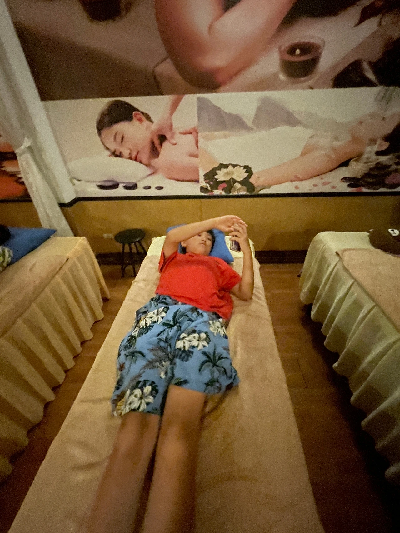 생각보다 빨리 끝난 손톱 손질을 뒤로하고 성 요셉 성당으로 향했다. 동남아 여행에선 한 번씩 찾는 성당이나 힌두교 사원이 더 특별한 존재다. 아이들도 더 이상 사원을 보고 싶지 않다고 여행 후 매일 남기는 밴드의 일기에도 쓰곤 했으니 말이다. 성당을 둘러보고 간단하게 점심과 저녁 사이의 음식을 반미로 먹고 여행자 거리와 떨어진 마사지 숍으로 향한다. 여행자 거리에선 1시간에 350,000동 하는 마사지가 여행자 거리를 벗어나면 250,000동으로 바뀐다. 1km를 걸어 아이들은 발 마사지를, 나는 얼굴 마사지를 하누시간 받기로 했다. 셋이서 누워 비엔티안의 108배와 닌빈의 무아동굴 등산의 피로를 씻는다. 나는 한 달간 고생한 피부에게 발마사지를 양보했다.