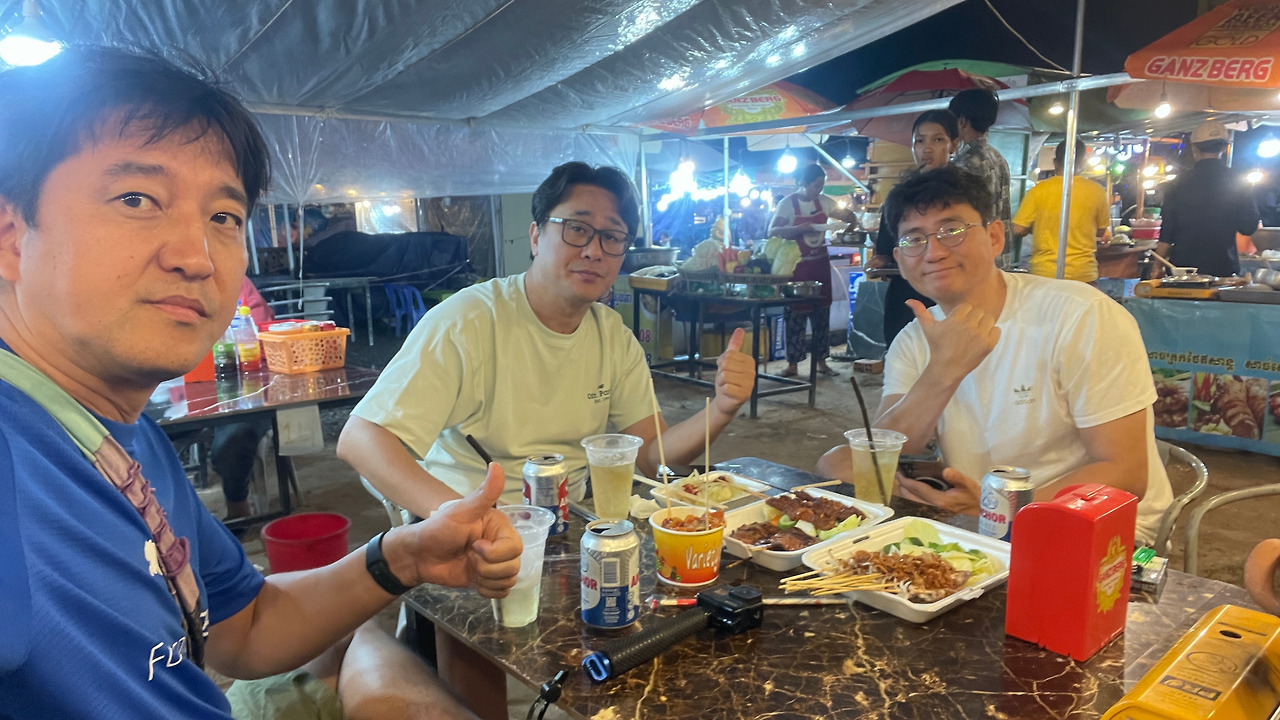 땀이 베인 옷을 갈아입고 잠시 쉬다가 야간 수영을 했다. 야시장을 방문하기 위한 시간 벌기용이었으나 수영장에서 흐린 날씨 때문에 일몰은 볼 수 없었다. 조금 지나니 소나기도 내려 야시장은 물 건너 가나하는 생각과 함께 우중 수영을 즐겼다. 통제되지 않는 상황은 여행 중에는 그저 즐기는 것이 최고다. 다행히 비가 그쳐 내국인이 주로 가는 노리아 섬에 있는 야시장과 외국인 여행자 위주의 프놈펜 야시장을 순차적으로 방문하고 숙소로 돌아왔다.