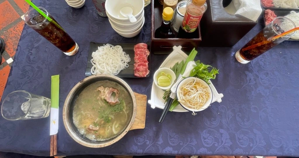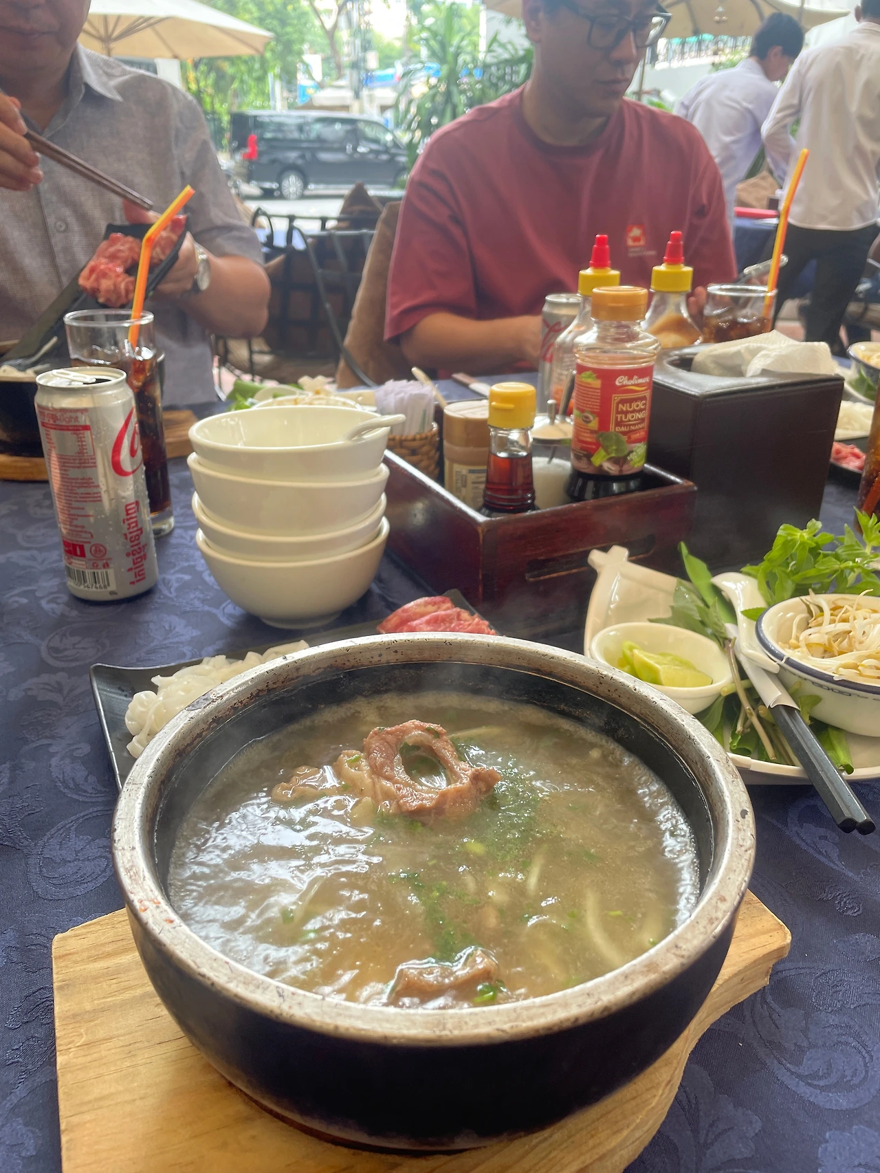 이후, 친구와의 마지막 일정으로 아침 겸 점심을 먹으러 이동했다. 이동하며 캄보디아의 다양한 상황에 대해 이야기를 나누며 이동했다. 대학을 나온 은행직원도 신입은 월급이 400달러 정도밖에 되지 않는다고 한다. 점심은 그래서 대부분 싸서 다니고, 밖에서 사 먹을 경우에도 1-2달러 정도로 소비한다고 한다. 물론 대리급은 1,000달러가 넘기도 하지만 아직 저개발국을 갓 벗어난 캄보디아의 양면을 느끼게 해주는 대화였다. 5성급 카지노에서 돈을 탕진하는 가진 자와 오늘도 구걸로 하루를 연명하는 가난한 자들이 뒤섞인 프놈펜, 라오스의 가난과는 한참 다른 모습과 기억으로 남아있다. 짧은 대화 끝에 도착한 식당은 베트남 식당이었다. 지점장 친구가 베트남과 인도네시아에서도 근무했었는데, 아직 6개월의 캄보디아 생활에 완벽히 적응하지 못한 모양이었다. 특히, 음식에 대해서는. 자주 오는 식당이라 본인이 알아서 시킨다고 했다. 한국인 입맛에 가장 맞는 것이 베트남 음식이라 생각하고 있어 그의 선택에 맡겼다. 오늘의 아침 겸 점심 메뉴는 뚝배기 도가니 안심 쌀국수와 소 내장 구이 모둠이었다. 역시 우리 입맛에 착 달라붙는 것을 넘어 상당한 맛을 선사했다.