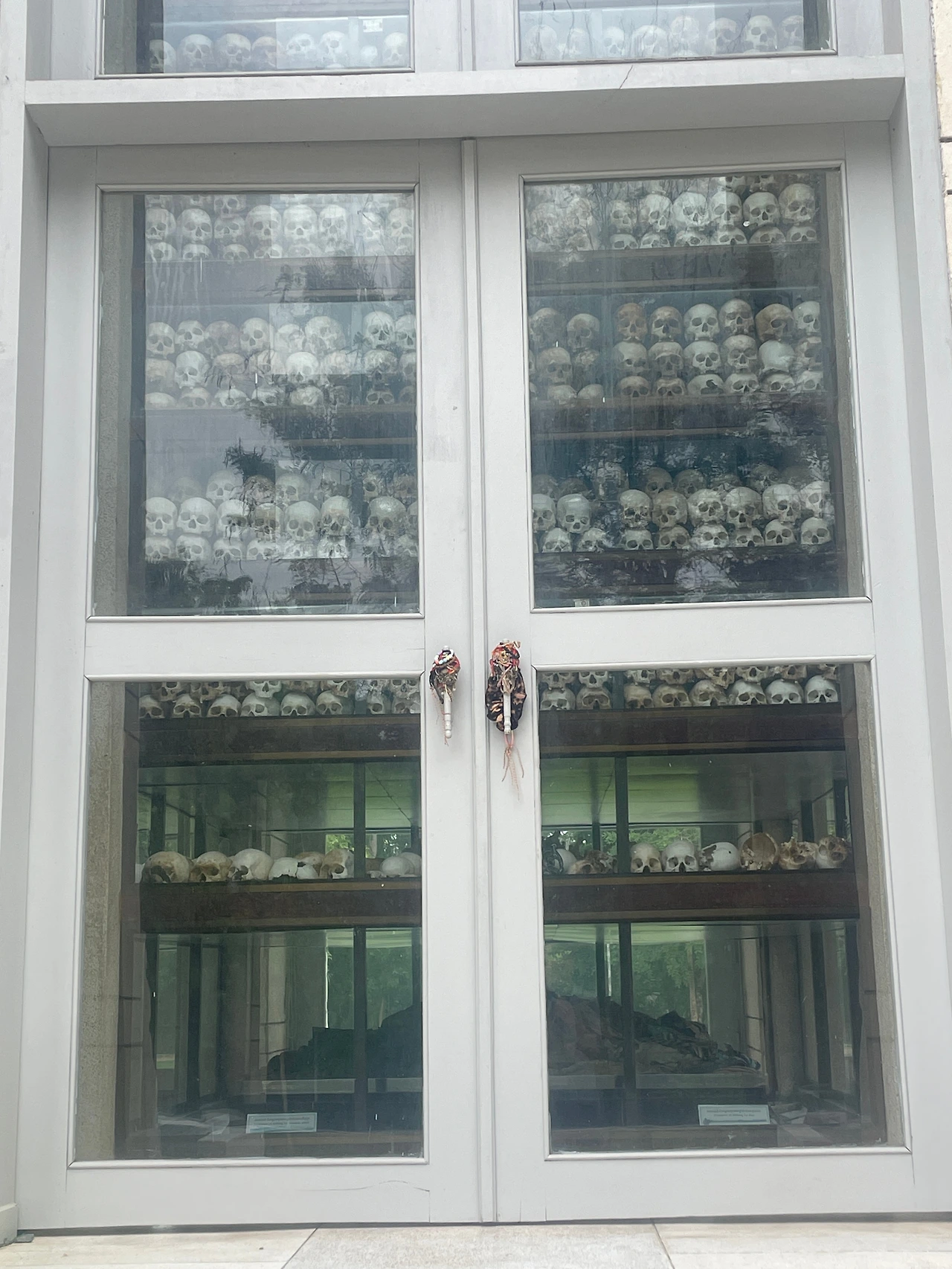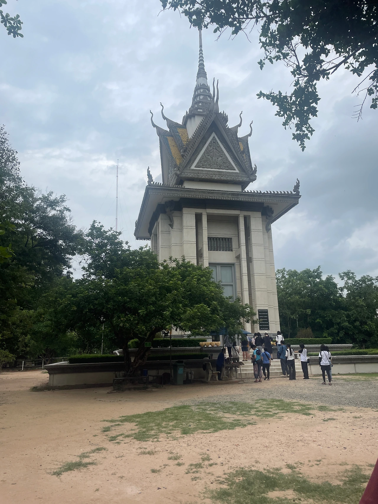 쌀국수를 맛있게 먹고 우린 이제 친구와 헤어져 우리만의 여행을 하게 되었다. 토요일 귀국이지만, 한창 바쁘신 몸이라 오늘 이별을 고해야 했다. 친구는 우리를 중앙시장에 내려주고 짧은 인사를 한 뒤 차를 타고 도로를 미끄러지듯 사라졌다. 우린 중앙시장을 한 바퀴 돌며 맛나게 보이는 음식을 스쳐 보내고 이것저것 구경을 했다. 2003년과 2018년에 한 번 방문해 보았는데, 시간이 지남에 따라 발전하고 있는 모습을 보이곤 있었지만 그 속도는 도심의 빌딩숲이 조성되는 속도에 비해서는 느리게 느껴졌다. 시장을 뒤로하고 메콩강 변 여행자 가리에서 마사지를 받고, 친구들 데이터 전용 유심을 구입하고 킬링필드 관련 여행지를 가기 위해 4인용 툭툭을 그랩으로 불렀다. 10여 킬로미터 남쪽에 위치한 청아익 학살지(Choeung Ek Genocidal Center)를 방문했다. 뚜얼슬랭 박물관과 함께 캄보디아의 비참했던 과거를 떠올리는 장소로 다크투어리즘의 대표장소이다. 캄보디아 하면 가장 먼저 떠오르는 관광지가 국기에도 등장하는 앙코르 유적이라는 세계적으로 유명한 건축물이고, 두 번째가 대량학살의 흔적이라는 것이 믿기지 않는 감정의 소용돌이를 만들어 낸다. 그들은 자국의 아픔을 치유하기 위해 이곳을 조성했는지, 관광수입을 올리기 위해 이곳을 조성했는지 조차 헷갈리는 느낌을 갖게 했다. 내국인 입장이 가능한 프놈펜의 휘향 찬란한 카지노 호텔과 10여 킬로미터 떨어진 곳에 방치되다 싶은 지역은 실로 큰 대비를 보여주었다.