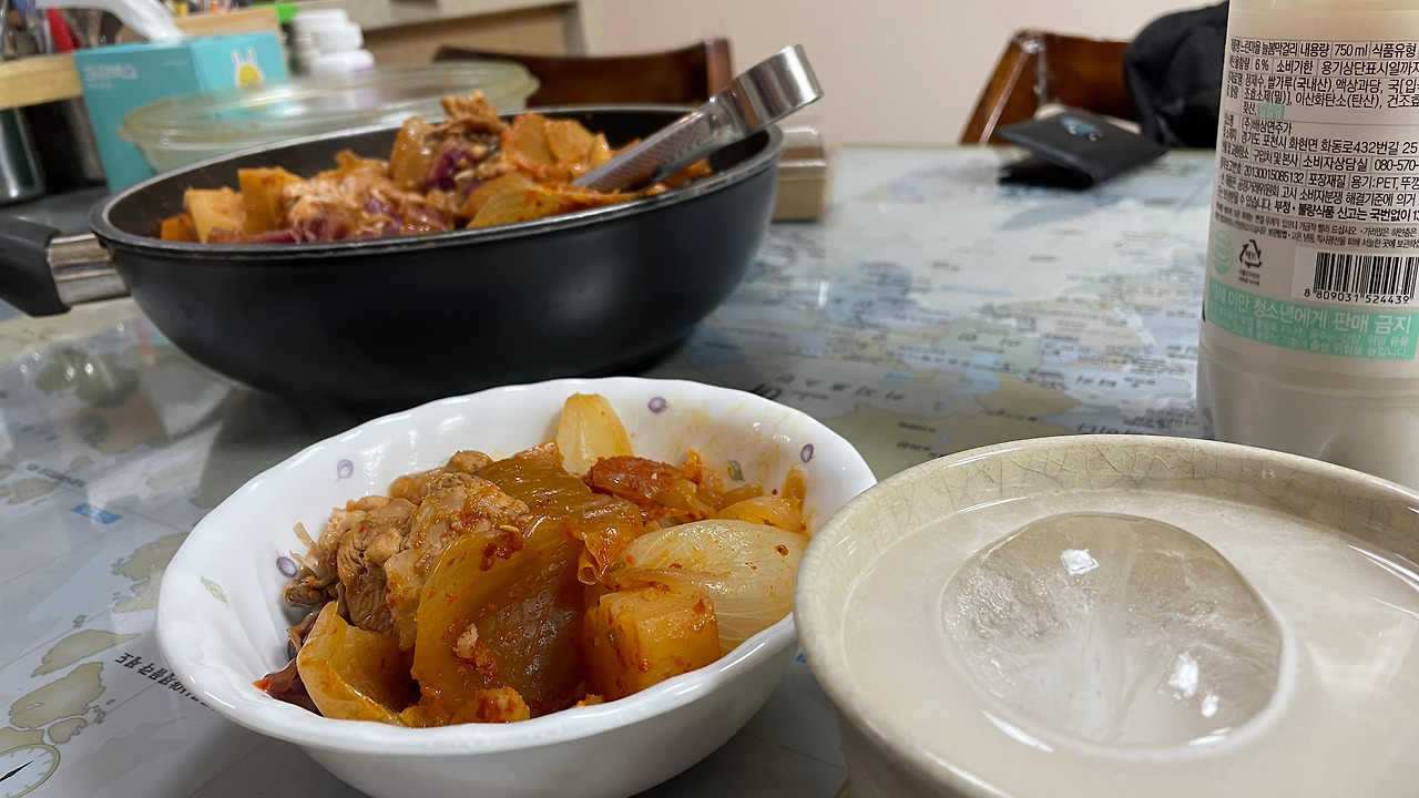 다시 한번 끓여낸 묵은지 닭볶음탕은 탄내가 많이 나지 않았지만 예상한 모습의 걸쭉한 국물이 있는 결과물이 아니었다. 막걸리 한 잔과 저녁으로 묵은지 닭 볶음탕을 먹는데 친구 녀석 2명이 집 근처로 술 마시러 온다고 해서 남은 닭볶음탕을 포장용기에 넣어두고 밖으로 나갔다. 아이들에게도 닭볶음탕에게도 미안했다. 다음번엔 제대로 만들어 주리라 다짐하며 친구들과의 술자리로 향했다.