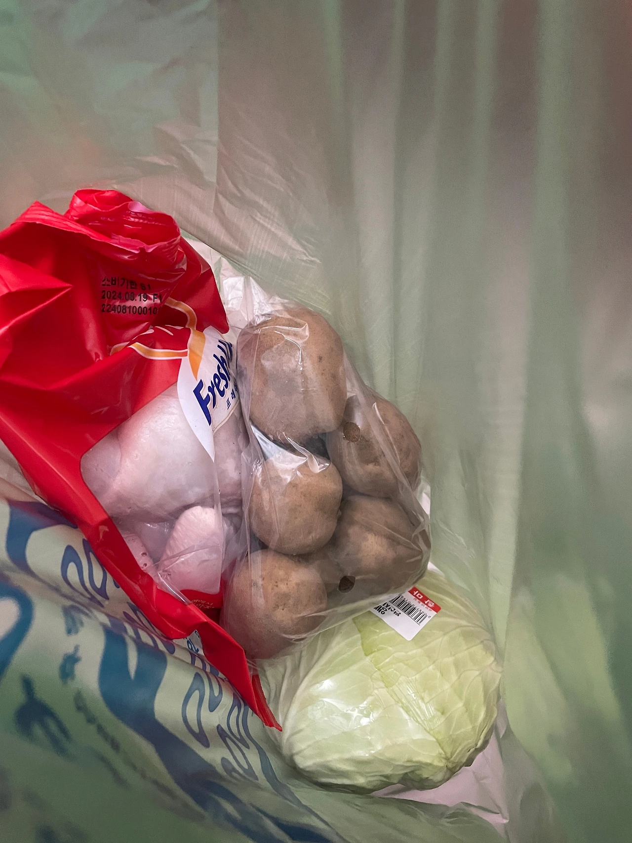 달리기를 한 뒤 퇴근하며 닭, 양배추, 감자를 구매했다.
