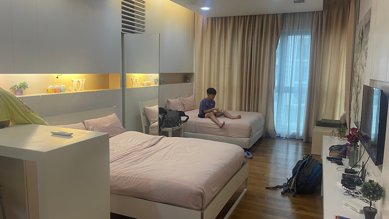 음식값 113링깃(35,000원)을 지불하고 그랩을 불러 숙소로 이동했다. 체크인 시간이 가능한 2시에 바로 입실을 했다. 숙소는 에어비엔비에서 예약한 레지던스 호텔이었고, 경비가 해당 숙소의 열쇠를 건네주어 쉽게 숙소로 들어올 수 있었다. 이 숙소를 선정하게 된 가장 큰 이유는 인피니티 풀과 일반수영장 두 개가 있다는 것이었다. 아직 관광이나 자연을 만끽하고 싶은 나이가 아니라 물놀이를 좋아하는 아이들의 성향을 반영한 것이었다. 쿠알라룸푸르에서 이런 숙소들을 상당히 저렴한 가격으로 예약할 수 있는데, 내가 미리 예약한 것을 감안하더라도 3박에 130,000원이면 호찌민시 3박 93,000원에 비해 숙소 가성비가 극히 훌룡하다고 할 수 있다. 숙소 상태도 3인이 지내기에 충분했고 깔끔했다.