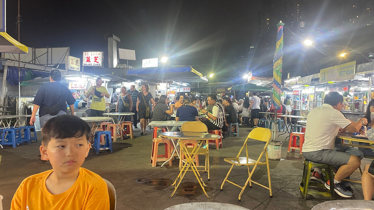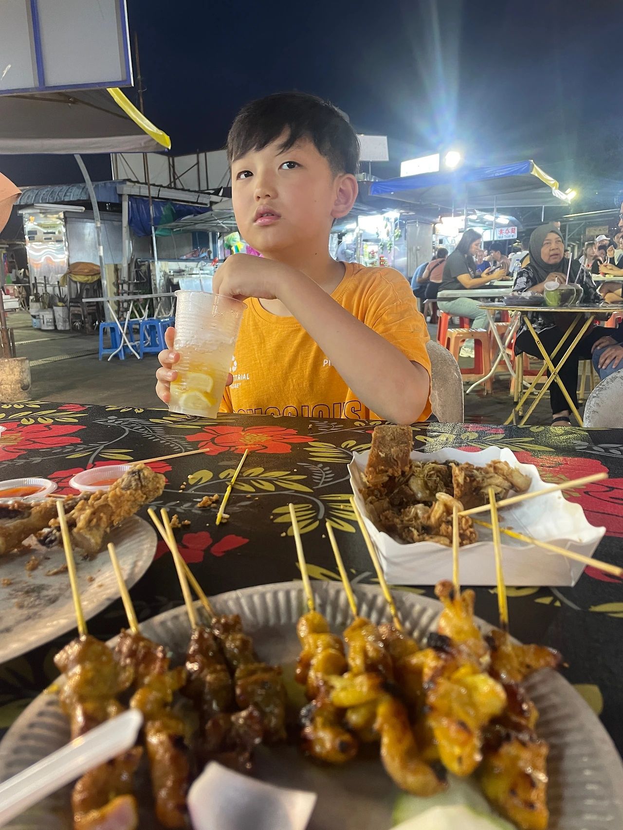 아이들을 동반한 여행에서 이번에 절실히 느낀 것은 수영장 유무이다. 애들은 수영장만 있으면 하루 종일 숙소에서 놀 수 있는 거 같다. 수영장에서 데리고 나오는 게 힘들다. 게임으로 유혹하여 일단 데리고 나온 뒤 외출 준비를 하고 빨래를 돌려놓은 뒤 저녁을 먹으러 나갈 준비를 하는데 한 바탕 소나기가 쏟아진다. 비가 그치기를 기다린 뒤 저녁식사를 하러 나간다. 오늘 저녁은 치킨에 푹 빠진 둘째를 위해 페낭에서 유명하다는 망고치킨을 먹으러 간다. 외출 준비하고 나서며 구글맵을 검색하니 망고치킨 집은 월요일이 휴무일이라 급하게 야시장을 검색하여 Gurney drive hawker centre라는 곳으로 향했다. 역시 메뉴는 둘째가 유일하게 잘 먹는 닭고기를 먼저 사고 자리에 앉으면 음료를 파는 사람이 와서 음료를 파는 시스템으로 캄보디아 프놈펜 야시장 시스템과 유사했다. 음료를 파는 분께 음료도 주문하고 앉았다. 치킨 몇 조가을 맛보고 소고기, 닭고기, 양고기 사테(satey-꼬치)를 구입해서 같이 배부르게 먹었다.