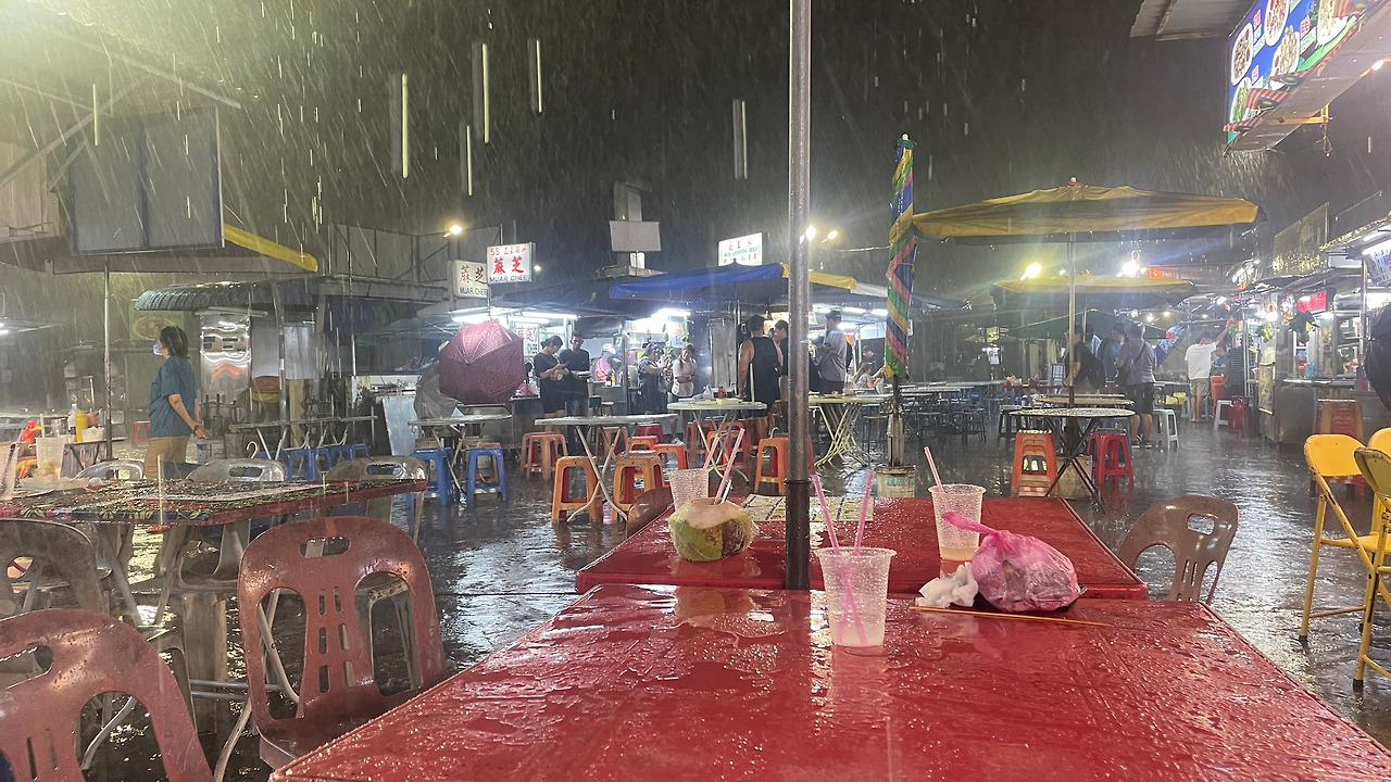 음식을 다 먹고 다른걸 한 번 먹어볼까 생각하는 찰나에 비가 조금씩 내리기 시작했다. 열대지역의 비를 직감하고 파라솔이 쳐 있는 자리로 애들을 데리고 몸만 피했다. 몇 초 뒤 비가 억수 같이 내렸다. 현지인들은 당연하다는 듯 처마 밑에서 유유히 먹던 음식을 먹고, 외국인들은 경황없이 우왕좌왕하는 혼돈의 야시장 풍경이 펼쳐졌다. 첫 번째 낭패를 당한 순간이었다.