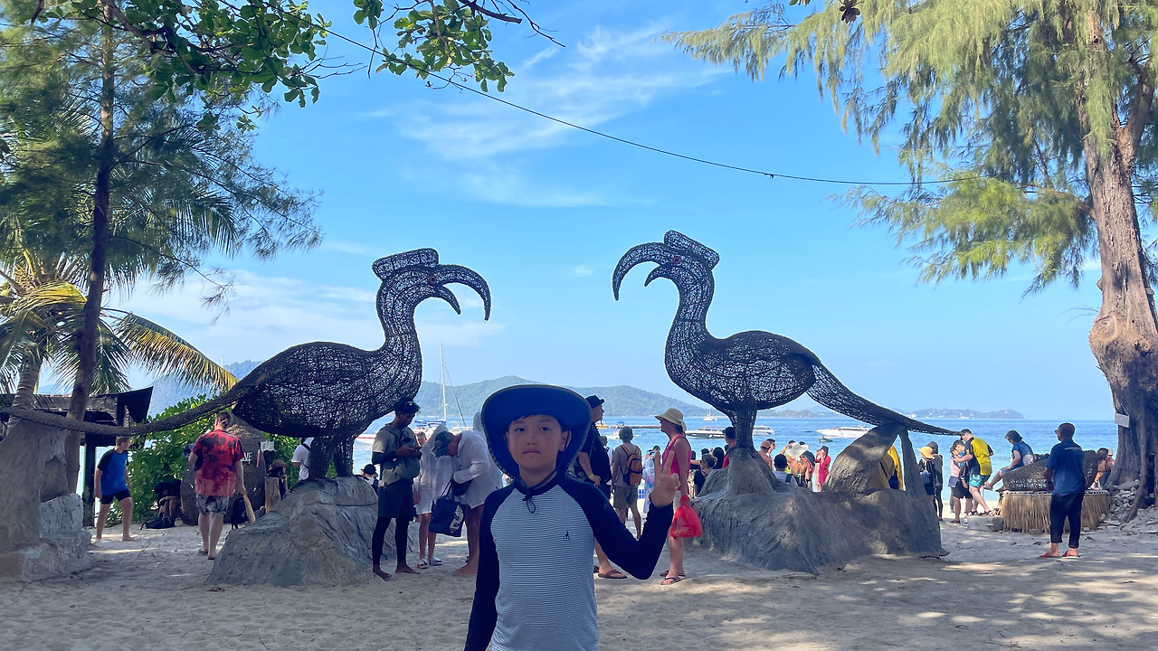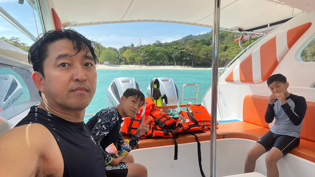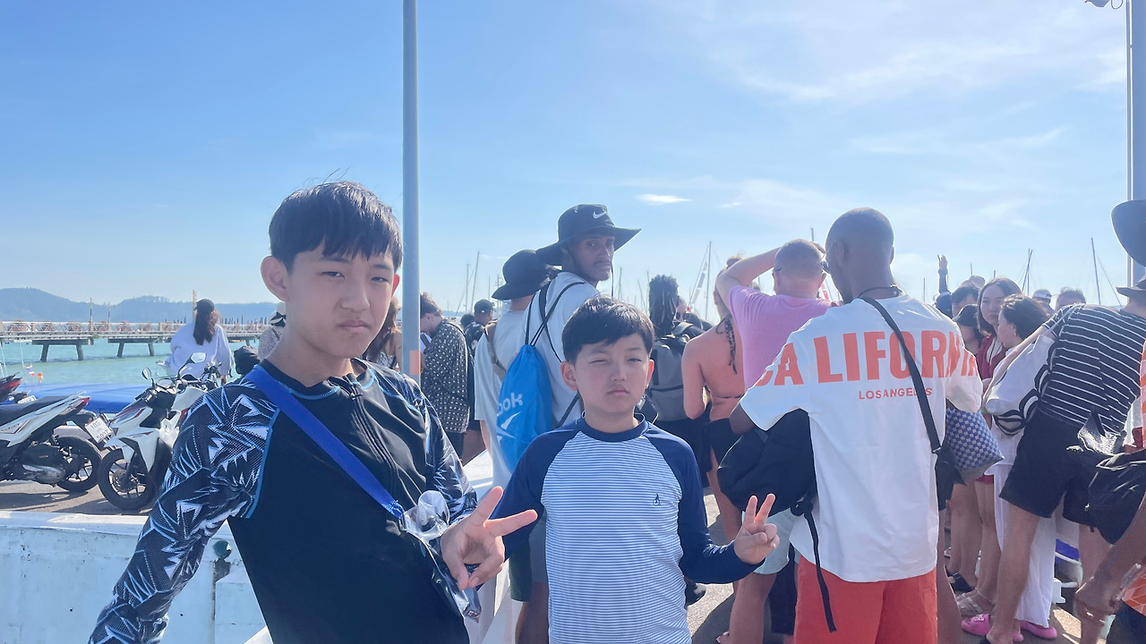 두 시간 동안 재미있게 놀았다. 비치슈즈를 신고 갔는데, 해변에서 벗고 놀다 보니 둘째와 나는 발바닥에 찰과상을 입었다. 따갑다며 보채는 둘째를 매정하게 타이르고 같이 놀다 푸껫으로 돌아갈 시간이 되어 배를 타러 이동했다. 집합하는 장소에서 마지막 사진을 찍고 5분여를 달려 선착장에, 1시간을 차량으로 이동하여 숙소에 도착했다. 피부가 빨갛게 달아올랐다.