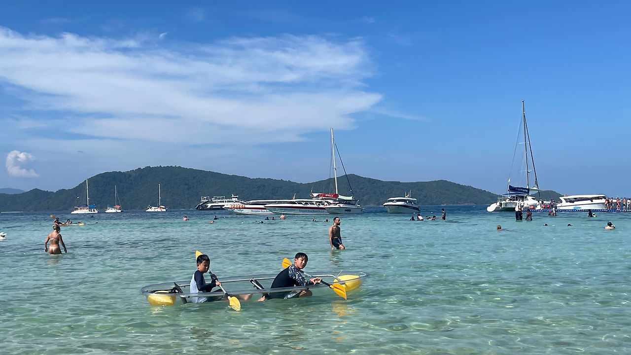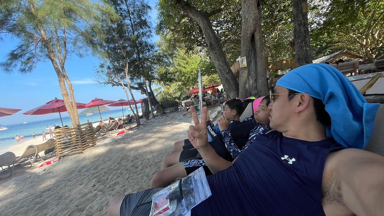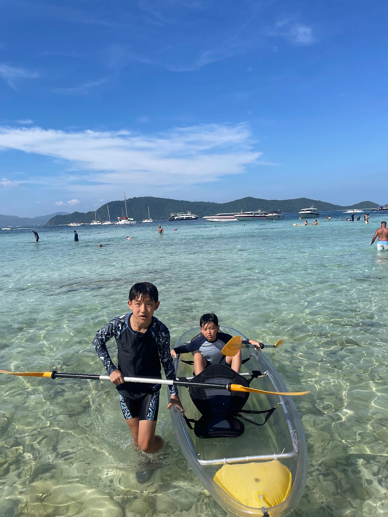 점심까지 해변에서 먹고 아이들과 바다에서 수영을 하며 놀다가 섬 반대편으로 트랙터를 타고 이동했다. 거기에서 두 번째 섬인 산호섬에 도착하여 2시간가량 자유시간을 보내는 일정이다. 거기서도 아이들은 물놀이에 시간 가는 줄 모르고, 나는 피곤에 지쳐 100밧을 주고 작은 썬배드를 빌려 지친 몸을 뉘었다. 아이들이 놀다가 카약을 하고 싶다고 해서 450밧을 주고 30분 동안 빌렸다. 섬이라 그런지 모든 게 다 비싸다.