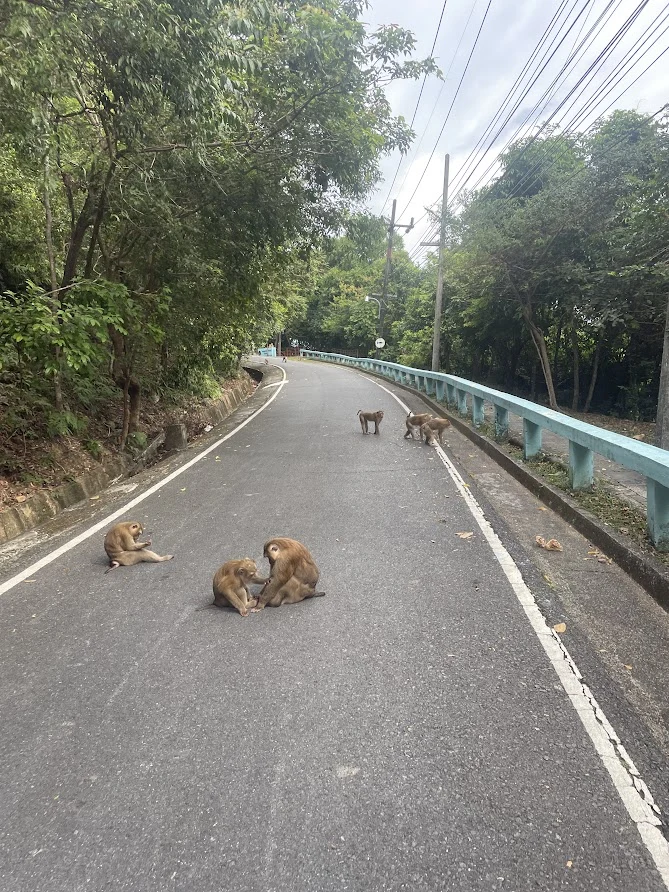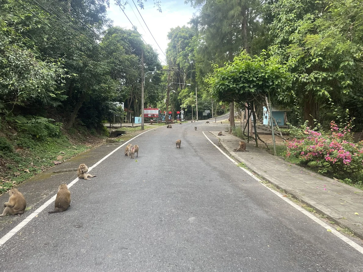 걷고 뛰기를 반복하며 도착한 몽키 힐은 말 그대로 푸껫타운에 있는 작은 산인데, 9부 능선쯤에 전망대가 있어 운동과 관광을 하기에 안성맞춤인 듯 보였다. 중간정도 오르니 매표소 같은 게 보였지만 자세히 보니 매표소가 아니라 원숭이 먹이를 파는 곳이었다. 원숭이가 가끔 출몰하는 줄 알고 빠른 걸음으로 통과했다. 통과하자마자 원숭이가 한 두 마리가 보이기 시작하더니 웬걸, 원숭이가 도로에 깔려 있었다.