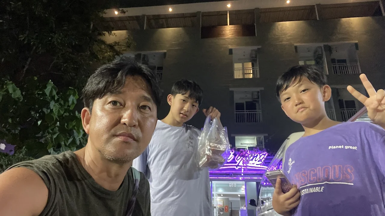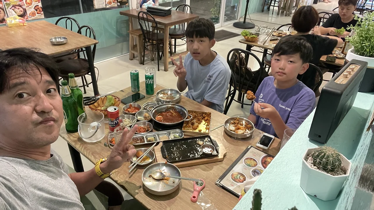 밀린 빨래를 대충 하고 신발도 씻고 베란다에 빨래를 널고 애들은 카드 게임을 하다 또 싸운다. 뭐라고 혼내니 또 첫째가 삐쳤다. 한숨 자다가 저녁을 먹으러 나가야겠다. 오늘은 둘째 생일이라 둘째가 원하는 한식을 먹으러 가기로 했다. 잘 먹이고 돌아와야 되는데 이것들이 잘 일어날지 또 걱정이다. 다행히 잘 자고 일어나 한식당으로 이동했다. 짧게 둘째의 생일 축하 노래를 부르고 엄마와 영상통화를 한 후 떡볶이부터 시작해서 한식으로 저녁을 거하게 먹었다. 여행 중 가장 비싸게 먹은 음식이었다. 돌아오며 야시장을 구경하고 물놀이에 피곤한 아이들을 데리고 일찍 잠자리에 들었다.