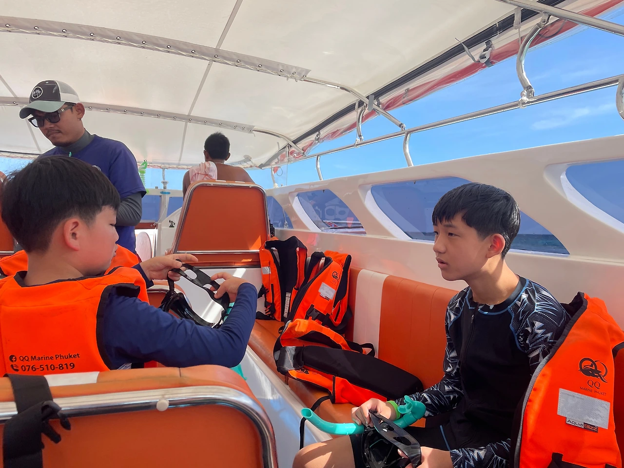 출발 전 교육을 받기 위해 도착한 투어 업체엔 60명가량이 모여있었고, 한국인 팀도 많이 보였다. 그린팀과 오렌지팀으로 구분하여 팔찌가 제공되었다. 희한하게 그린팀인 우리는 한국인이 하나도 없는 조합으로 구성되었다. 원래 푸껫에 오면 제임스 본드 섬이나 피피섬 투어를 가야 하지만 아이들이 어려서 장거리 스피드보트는 힘겨울 듯하여, 30분 거리에 섬투어로 사전 예약했다. 처음에 도착한 섬의 호핑 투어는 물살이 거세고 푸껫섬과 멀리 떨어지지 않아 물고기를 많이 볼 순 없었다.