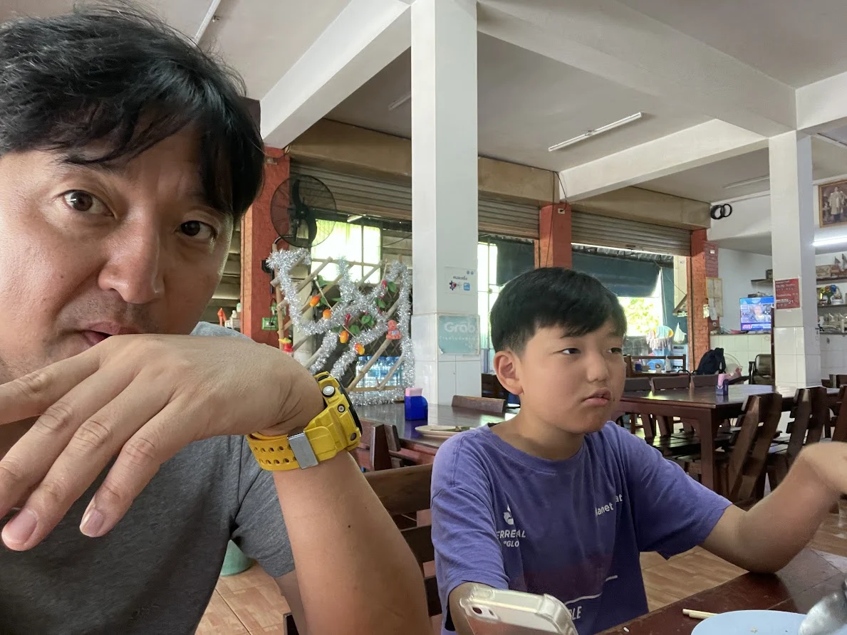 오토바이가 없으니 여간 불편한 게 아니다. 이동에도 많은 제약이 따라 실제 오늘 뭘 해야 할지 계획조차 서지 않았다. 일단 어제 약속했듯이 아침은 1.5km 떨어져 있는 팟타이 집으로 가기로 하고 운동화 끈을 동여맸다. 열심히 달렸으나 둘째가 처져 걷고 뛰기를 반복하며 식당으로 향했다. 벌써 등은 땀으로 흥건해져 있었다. 각자 원하는 음식을 시키고 아침 식사를 즐겼다. 음료수를 팔지 않아 식사 후 마시기로 하면서~