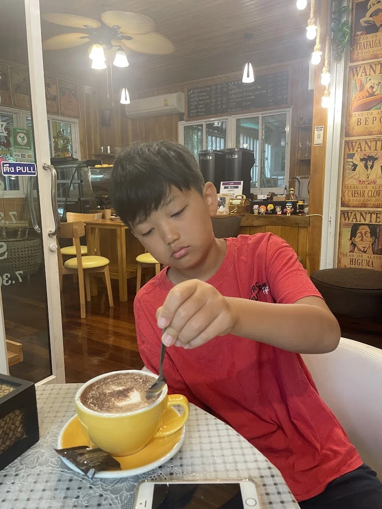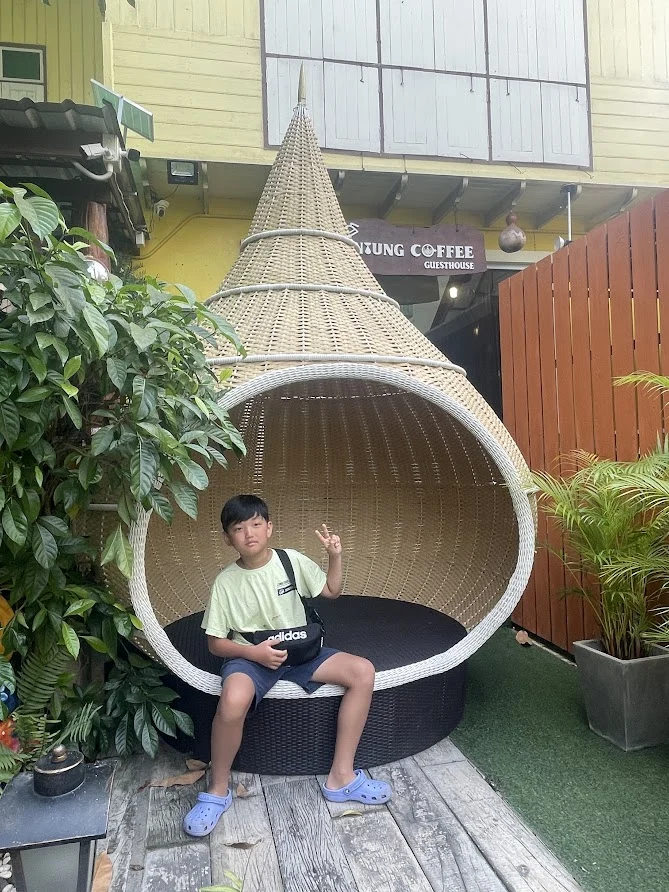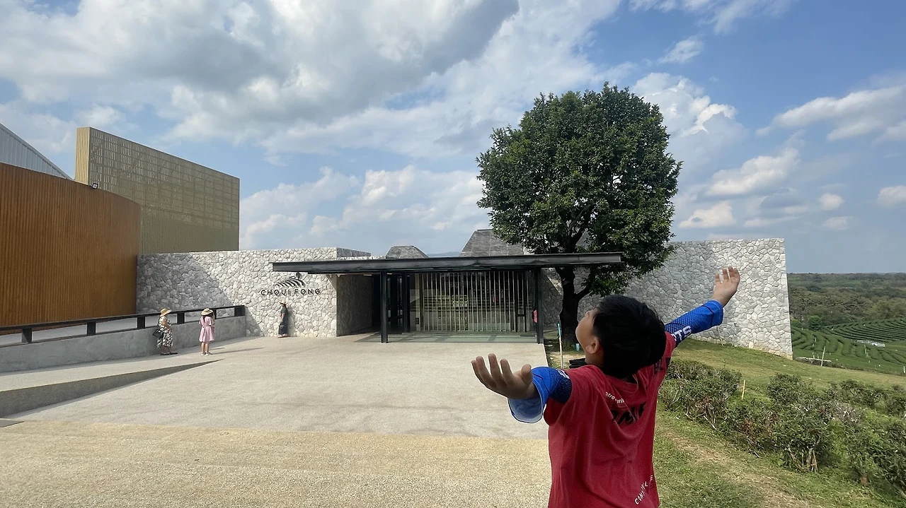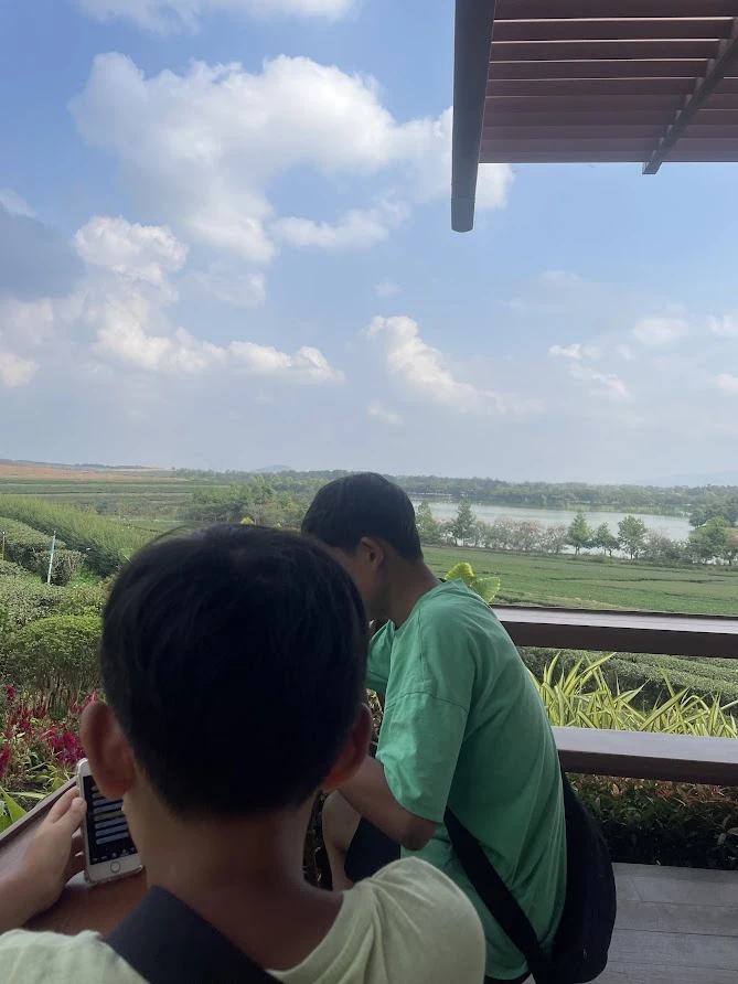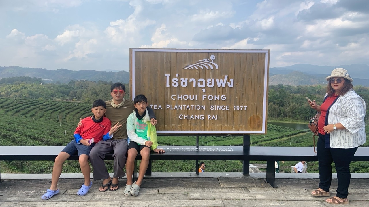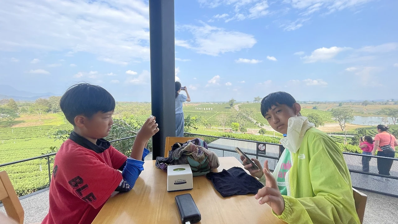 백색사원을 둘러보고 청색사원으로 이동하는 중간에 싱하 파크라는 공원이 있어 오토바이를 타고 들렀다 가기로 했다. 택시를 불러 가기에는 다소 애매한지 외국인보다는 현지인들의 비중이 훨씬 높았다. 도착한 곳은 마치 제주도 녹차 공원처럼, 녹차 밭 및 짚 라인등 넓은 면적을 다양하게 꾸며 놓았다. 집라인은 아이들이 군대에 가면 공짜로 태워주기 때문에 그때 타기로 하고 녹차밭이 내려다 보이는 카페에서 차 한 잔 하면서 풍경을 감상했다. 잠시 쉬다가 화장실에 들러 각자 볼일을 보고 청색사원을 가는 길에 위치한 숙소에 체크인을 하고 잠시 쉬었다.