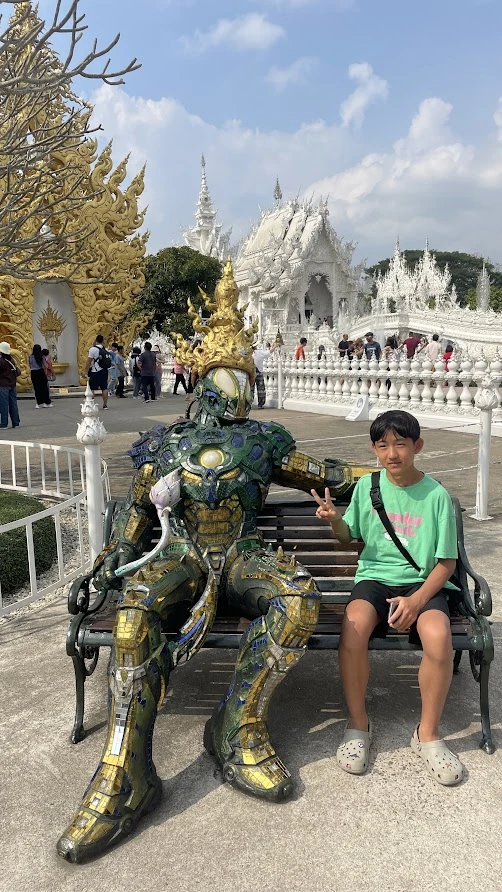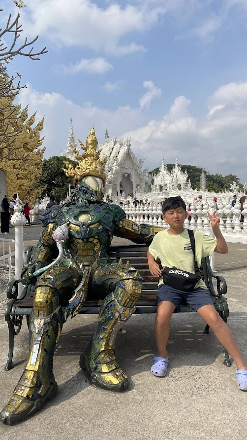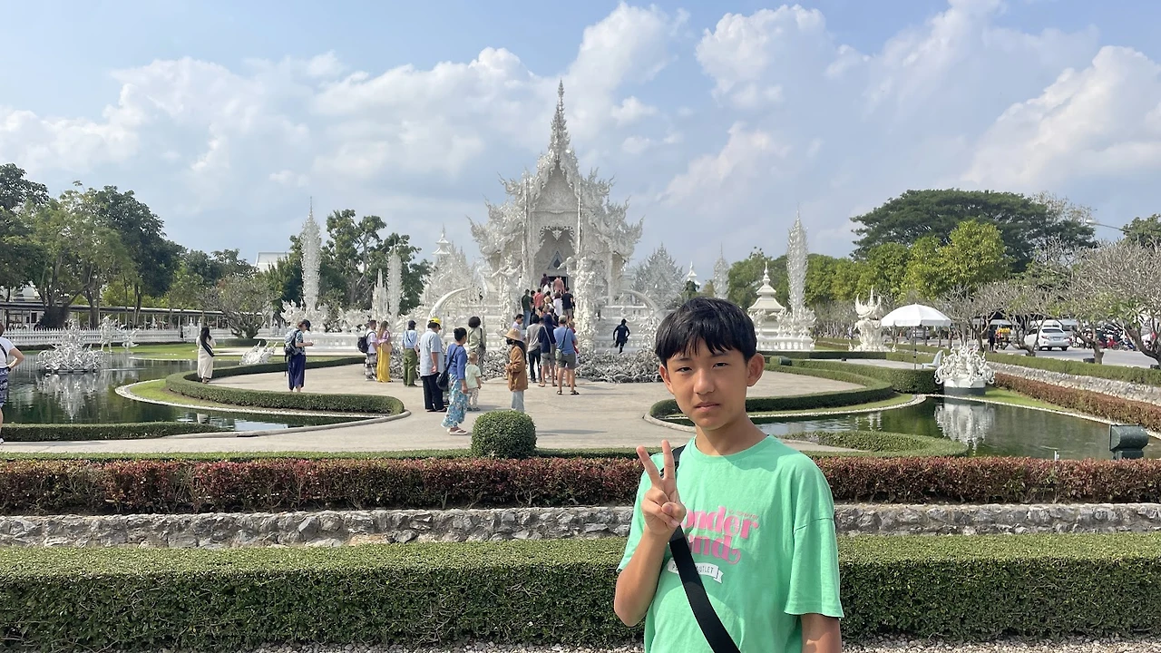 오토바이로 투어를 출발하면서 작은 아이를 앞에, 큰 아이를 뒤에 태우고 백색사원으로 향했다. 도로에 차가 별로 없었지만 오토바이와 도로에 적응하고자 천천히 달렸다. 12km 떨어진 백색사원을 20여분을 달려 도착했다. 약간의 구름 낀 맑은 날씨라 햇볕이 내리쬐다 숨었다를 반복했다. 남쪽에서부터 백색사원, 청색사원, 흑색사원이 위치하고 있어 치앙마이에서도 그룹으로 많이 방문하는 곳이라 이미 사람들로 인산인해를 이루고 있었다. 밖에서 사진만 찍고 갈려다 큰 애가 관심을 가져 인당 100밧씩 내고 입장하였다.