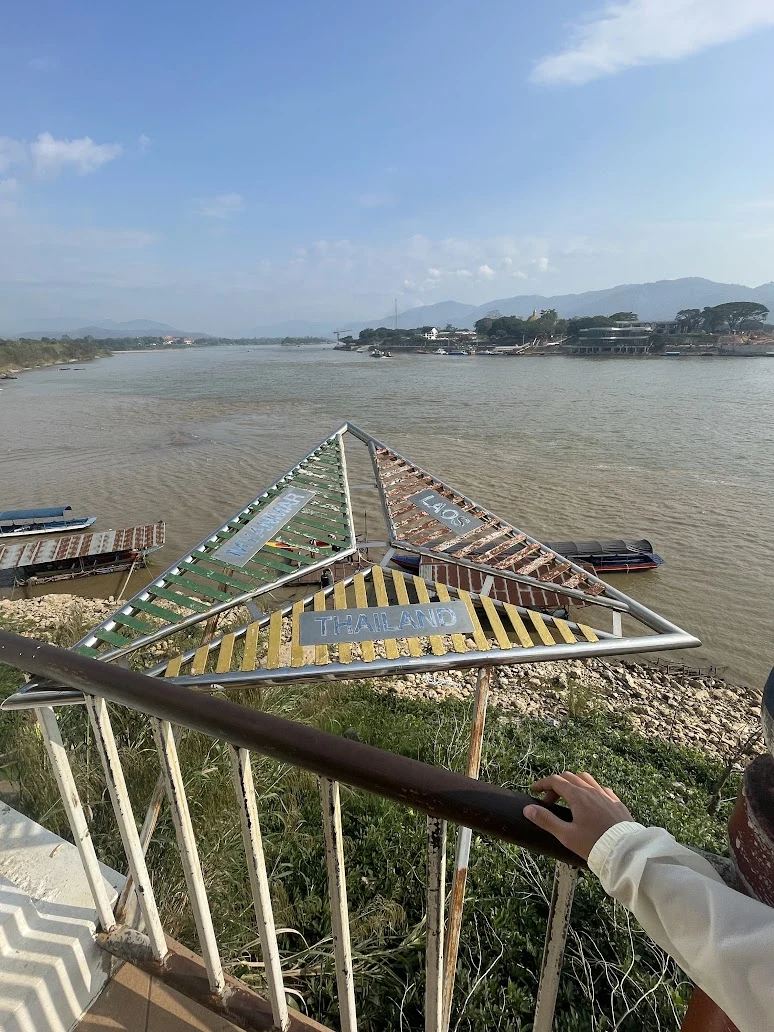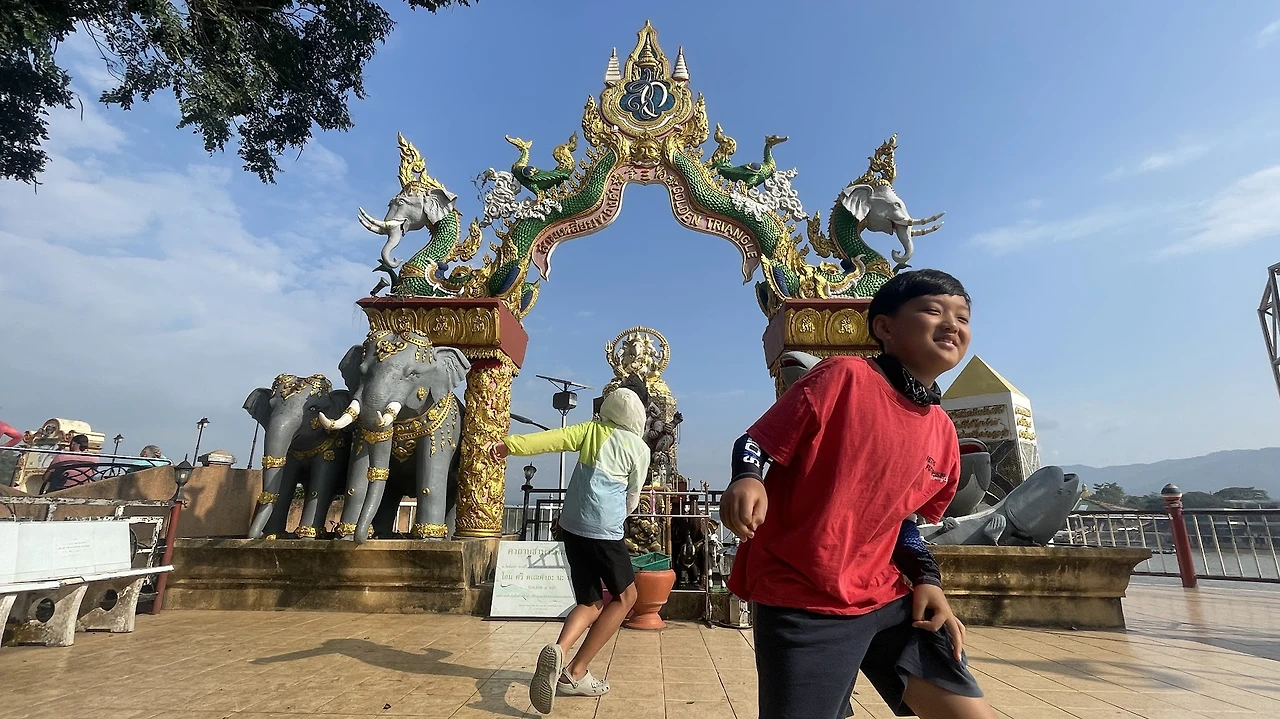 첫 목적지는 골든트라이앵글이었다. 숙소에서부터 70km 떨어진 곳으로 고속 국도 같은 곳을 아이 둘을 태우고 한 시간을 달려야 한다. 중간에 음료라도 마실 곳이 있으면 쉬었다 가려고 하였으나 고속국도 같은 도로가 대부분이라 도착하고 좀 쉬기로 했다. 한 시간여를 달려 15년 만에 다시 골든트라이앵글을 찾았다. 그때는 치앙라이 버스터미널에서 버스를 타고 치앙샌에 내려 다시 성태우를 타고 이동하는 루트라 시간이 많이 걸렸는데, 이번엔 두 아들을 태우고 왔지만 오토바이로 편하게 온 편이었다. 아이들에게 골든트라이앵글의 역사에 대해 설명을 해주고 어젯밤에 사놓은 과일과 음료를 마시며 국경의 다양한 모습을 둘러보았다. 예전엔 아무것도 없던 라오스 쪽은 카지노 사업의 열기로 마카오 같은 카지노 건물들이 즐비하게 들어서 있었다. 이와 대비하여 태국과 미얀마의 국경마을은 우리네 시골 마을과 다를 바 없었다.