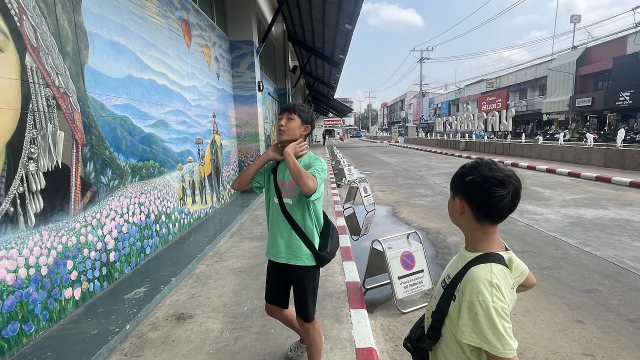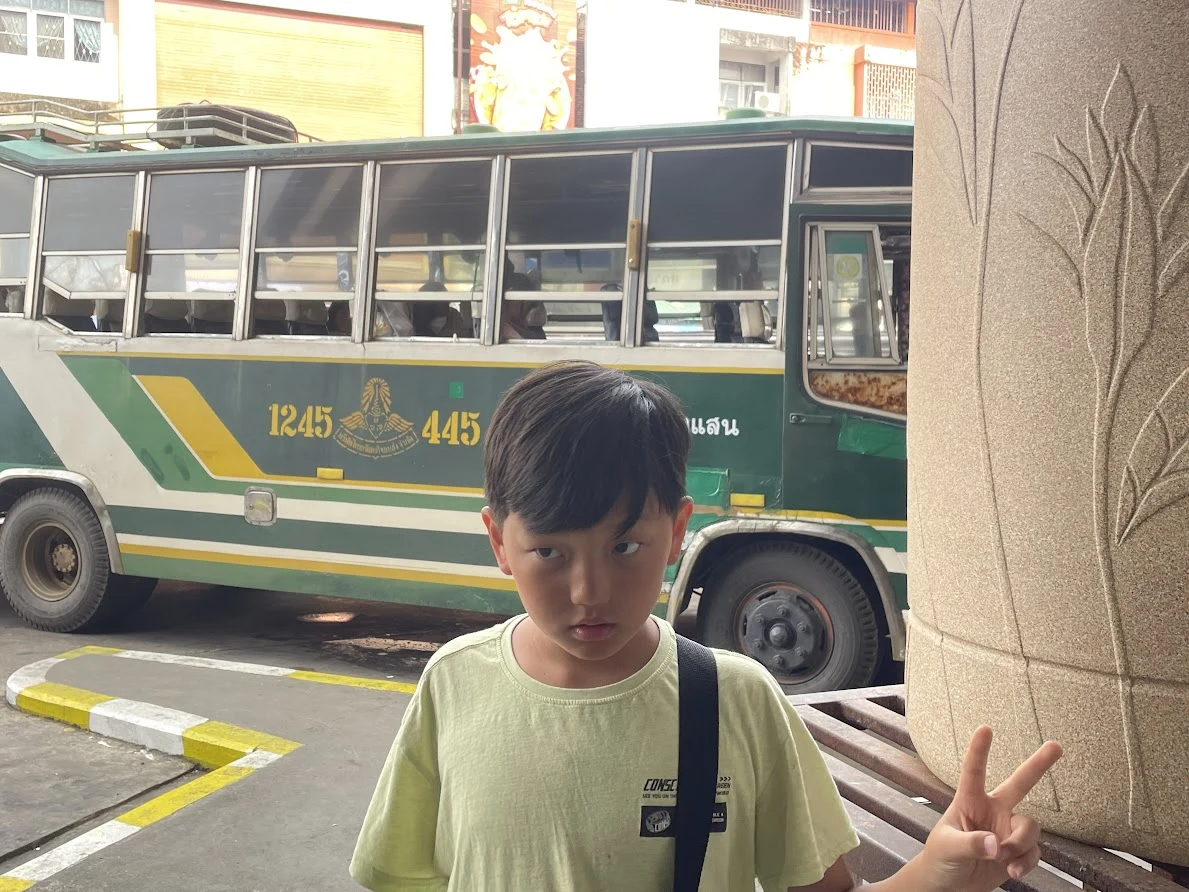 투어를 떠나기 전에 점심식사를 하고, 치앙마이로 가는 VIP버스(우등버스)를 먼저 예약했다. 이틀뒤에 치앙마이행 표가 없을 수도 있다는 말이 있어 걱정했으나 표는 있었다. 2명이 같이 앉을 수 있는 자리는 없어서 3명이서 일렬로 혼자 앉아가는 자리를 예약했다. 둘이 시도 때도 없이 싸우니 다른 사람들과 앉아가면서 불편함도 느끼고 이게 나을 수도 있다는 생각이 들었다. 예전엔 하루 두 편의 버스만 있었는데 지금은 코로나19 최악의 상황에서 많이 회복되어 하루 버스 편이 10편 이상 있었다. 그래도 최소한 떠나기 전 날에는 표를 예매해 두는 것을 추천한다. 버스 정류장도 아기자기하게 잘 꾸며 놓아 사진 찍기도 좋은 환경이었다.