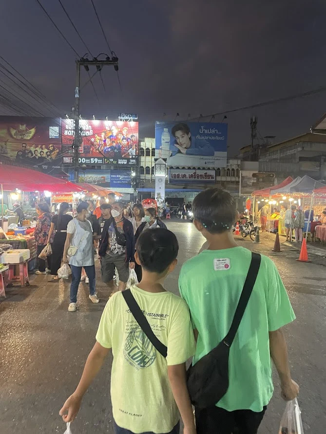 불상 내부의 제일 높은 공간에서 노을이 지는 치앙라이를 바라보며 쉬다가 야시장에 야식거리를 사러 갔다. 이것저것 담다 보니 야식을 무려 300밧어치를 샀다. 그중에 치킨이 200밧, 소시지 2개 30밧, 몽키 바나나 한 손 30밧, 100% 수제 오렌지 주스 2개 40밧을 구매하였다. 오늘 다 먹긴 힘들고, 내일 골든트라이앵글 라이딩에 먹거리로 가져가 소진할 생각이었다. 숙소에서 샤워를 하면서 좀 쉬다가 버스정류장 인근에서 열리는 치앙마이 대표 야시장까지 걸어서 이동했다. 15년 전 혼자 배낭여행을 떠나 라오스의 루앙프라방을 거쳐 도착했던 치앙라이와 야시장은 세월의 흐름만큼이나 시설 자체가 많이 바뀌어 있었다. 규모도 많이 커지고 먹거리도 예전보다 많이 늘어난 듯 보였다. 야시장에서 저녁을 먹고 이이들에게 내일 일정에 대한 안내를 했다. 걷는 것을 극도로 싫어하던 둘 째도 오늘 8층 탑도 걸어서 오르고 내일 장거리 일정에도 크게 동요하지 않았다.