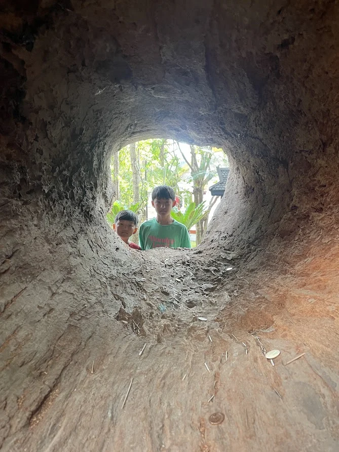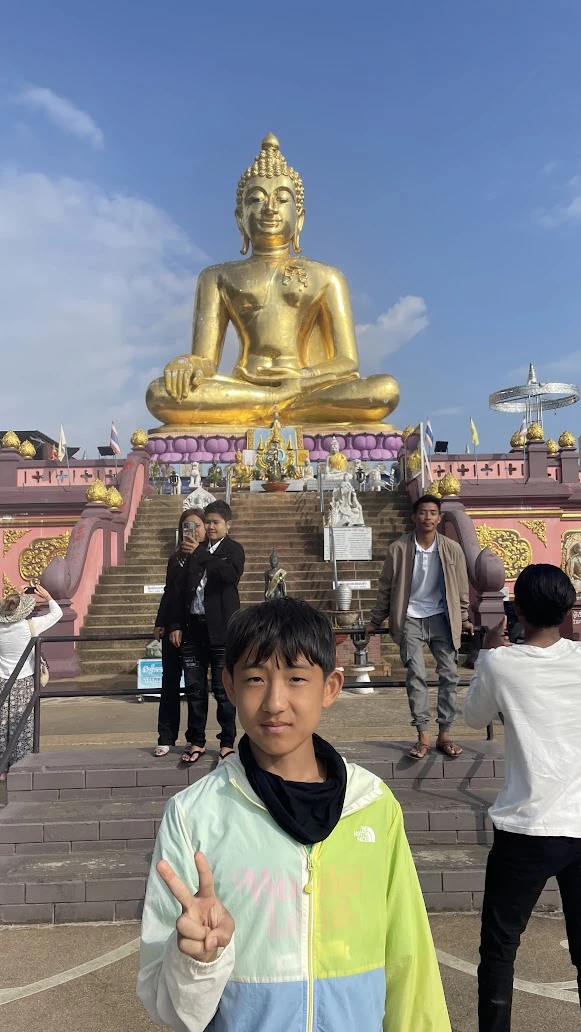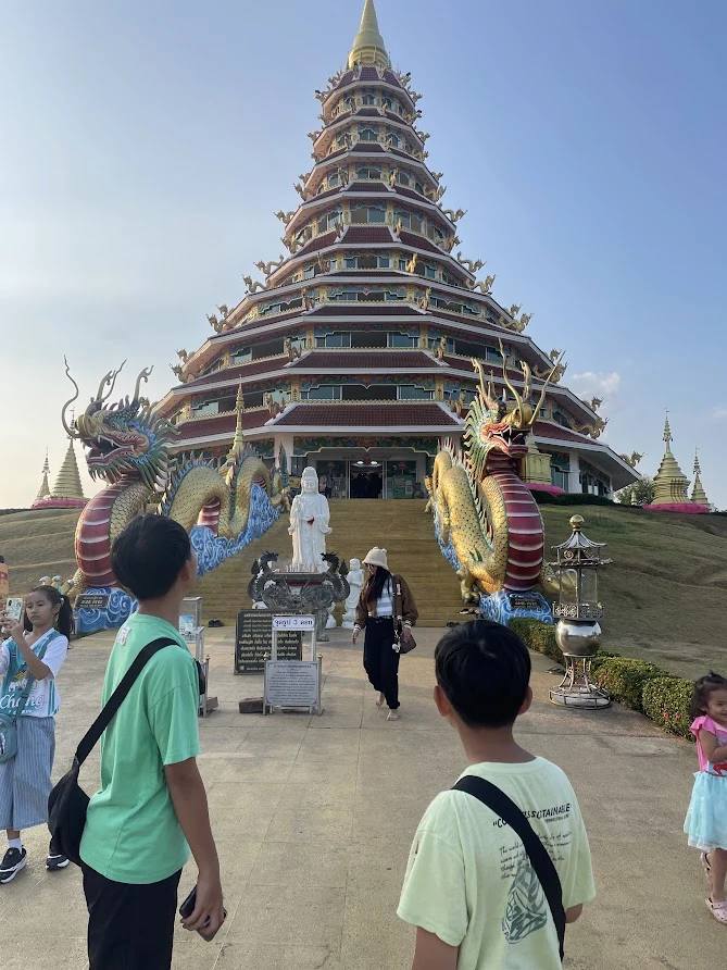 숙소에 짐을 풀고 잠시 휴식을 취하고 청색사원으로 향했다. 무료입장이고 사원을 둘러싸고 가게가 즐비한 모습이 백색사원과는 다른 느낌이었다. 백색사원을 지은 건축가의 제자가 지은 곳이라고 하고 보니 색깔을 제외하고 비슷한 면이 많이 있다는 생각이 들었다. 아이들과 사진을 찍고 청색사원에서 유명하다는 코코넛 아이스크림도 먹고 잠시 쉬다가 후어이쁠라깡 사원으로 향했다. 이곳은 마치 크기로 승부하는 중국의 사원을 보는 듯했고, 내부에는 정교한 불상이나 조각들이 많아 충분한 볼거리를 제공했다. 20밧 식당이 있어 식사도 저렴하게 제공하는 듯하였는데 내가 도착한 시간엔 식당들이 정리를 하고 있었다. 대표적인 8층 탑과 거대 불상이 있는데, 탑은 걸어서 올라가고 불상은 내부에 엘리베이터가 있고 비용은 인당 40밧이었다. 입장료도 따로 없고, 순환 차량도 무료로 운행해 사원에 시주를 한다는 마음으로 유료 엘리베이터를 탔는데 26이라는 숫자에서 내리는 거 보니 그 정도 높이인 거 같았다.