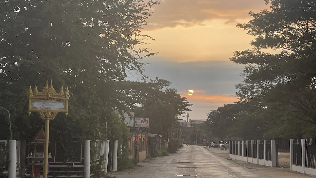 사원의 서쪽은 치앙라이를 한눈에 바라볼 수 있게 트여 있었다. 노을을 보기 좋은 위치. 동쪽 편으로 이동했는데 갑자기 큰 개 한 마리가 으르렁 거리며 달려왔다. 개는 훌륭하다에서 배운 대로 등지지 않고 개의 눈을 보며 개가 긴장을 늦추길 기다렸다. 조금 뒤 또 다른 개가 나타났다. 똑같이 행동을 취하니 두 다리를 들어 내 몸으로 몇 번 뛰어오르다 흥미를 잃었는지 돌아갔다. 이 상황에서 나는 정신이 나갔다 다시 돌아왔다. 이 사원은 여기까지라 생각하고 오토바이를 타고 숙소로 향했다. 가는 길과 다른 길을 이용하여 복귀하다 치앙라이 구 공항 활주로를 발견했다. 아쉬운 대로 여명을 느낄 수 있었다. 딱 뛰기 좋은 장소란 생각이 들었고 현지 주민들도 달리기를 하는 사람들이 많이 있었다. 다음 기회엔 꼭 다시 찾아 뛰고 싶은 장소였다. 오토바이를 몰고 그곳을 뜨려는 찰나 작은 도로변에서 떠오르는 태양을 마주했다. 이거면 됐다는 생각이 들어 사진 한 장을 남기고 숙소로 돌아왔다.
