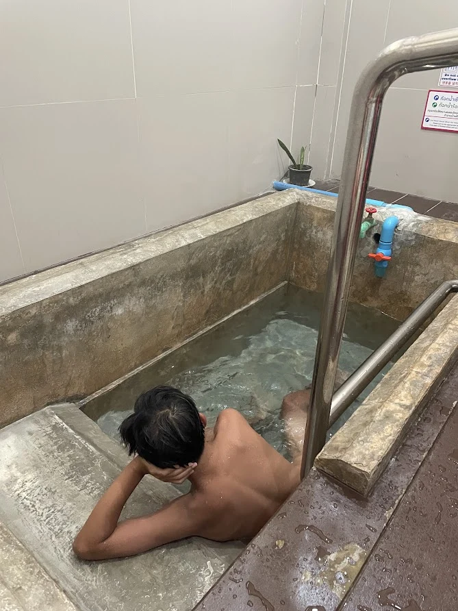 녹차 받을 나와 또 30km 달려 블랙하우스에 도착했지만 어린이들이 관람하기엔 좀 난해한 전시물이 많아 박물관 앞에서 기념사진 한 장 찍고, 화이트, 블루, 블랙 투어를 완성했다. 이후 달려간 곳은 최종 목적지인 뽕 프라팟 온천이었다. 족욕만 하려는 아이들을 구슬려 개인탕을 3인 160밧에 대여하고, 계란과 수건을 추가 구매하여 들어갔다. 타이마사지가 한 시간에 150밧이었지만, 문을 닫을 시간이 다 되어서 마사지는 예약하지 못했다. 전체 이용 시간은 한 시간이고 처음엔 둘째가 뜨겁다고 거부해서 찬물로 온도를 맞추고 셋이서 탕 속에 들어가 피로를 풀었다. 한 시간 후 개운한 맘으로 온천을 나와 찾아놓은 식당이 문을 닫아 인근 국숫집에서 번역 앱을 돌려가며 3그릇을 시켜 저녁 식사를 했다. 배낭여행 중 먹은 최저 가격 식사였다. 3그릇에 135밧을 지불하고 앵무새기 있어 아이들이 좋아했던 식당을 나와 숙소에 도착했다. 200여 km에 달하는 대망의 라이딩이 끝나고 다들 소리소문 없이 일찍 잠들었다.