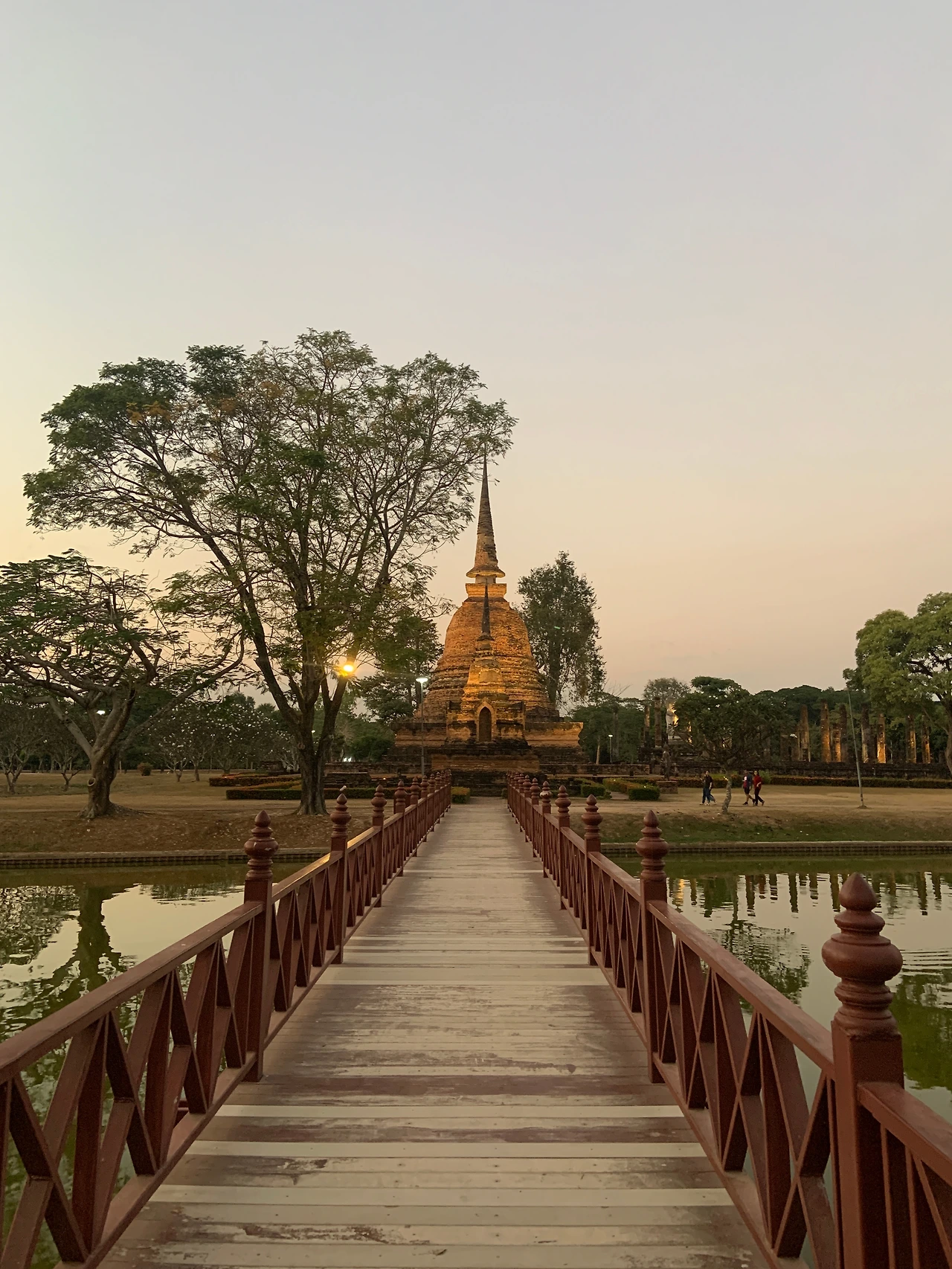 짐을 풀고 아이들은 수영장에서 쉬도록 하고, 나는 오토바이를 빌리러 다시 걸어왔던 길을 느리게 뛰면서 올드타운 중심가로 향했다. 구글 지도에도 나오지 않는 오토바이 렌털샵을 찾아 오래된 오토바이를 빌리고, 이틀 뒤에 떠나는 아유타야행 버스를 예매했다. 24시간이면 내일 오후+다음날 오전에 반납을 하면 되어 24시간 300밧인데, 36시간 500밧에 렌트를 했다. 버스 티켓도 아유타야 일정이 1박이라 이틀 뒤 아침 일찍 8:15에 출발하는 것으로 예매했다. 티켓 예매를 하면서 티켓 파는 아저씨로부터 오늘 랑캄행 대왕 행사가 밤에 있다는 소식을 듣고 아이들과 함께 행사에 참여하기 위해 준비하러 숙소로 돌아왔다. 아직까지 수영장에서 놀고 아이들을 챙겨 수코타이 역사공원으로 오토바이를 타고 이동했다. 밤에는 역사공원을 개방하지 않는데, 타이밍을 잘 맞춰 입장료도 무료에 밤의 수코타이 유적을 볼 수 있는 기회를 우연히 갖게 되었다. 밤의 수코타이는 낮과는 또 다른 모습이었다.