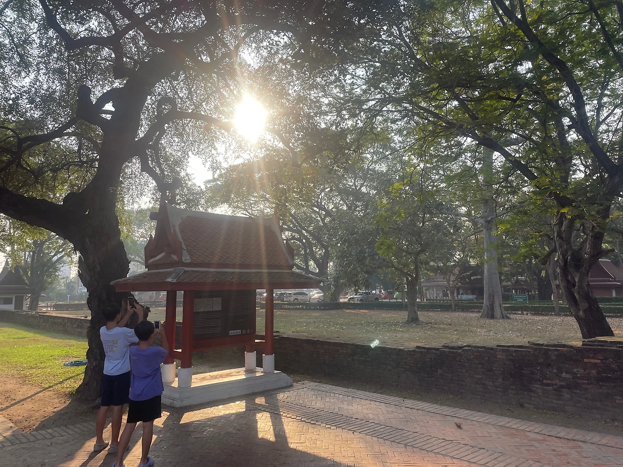 오토바이를 타고 첫 목적지인 왓 마하탓으로 갔다. 오토바이 주차를 하고 입장권 두 매를 사서 입장했다. 8:00 오픈 시간에 맞춰 대여섯 명이 입장했다. 사람이 없는 조용한 사원을 둘러보며 유명한 불상의 머리 앞에서 사진을 찍었다. 이곳에는 벌써 관리자가 상주하며 불상 머리보다 사람의 머리가 높게 나오게 찍는 것을 제지하고 있었다. 세 번째 아유타야 방문이지만 1박 2일의 짧은 일정이라 이번엔 기본적인 유적지만 아이들에게 보여주고 나머지는 아이들의 몫으로 남겨두기로 했다.