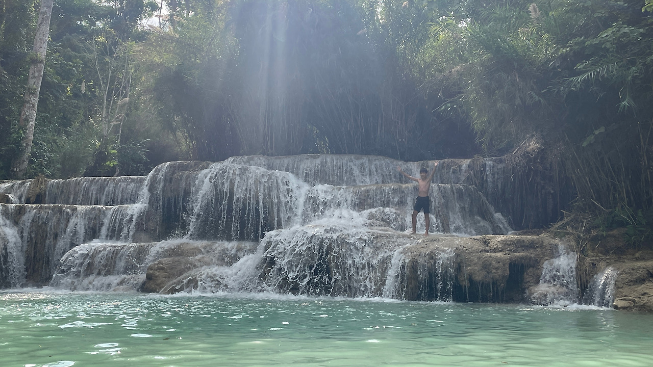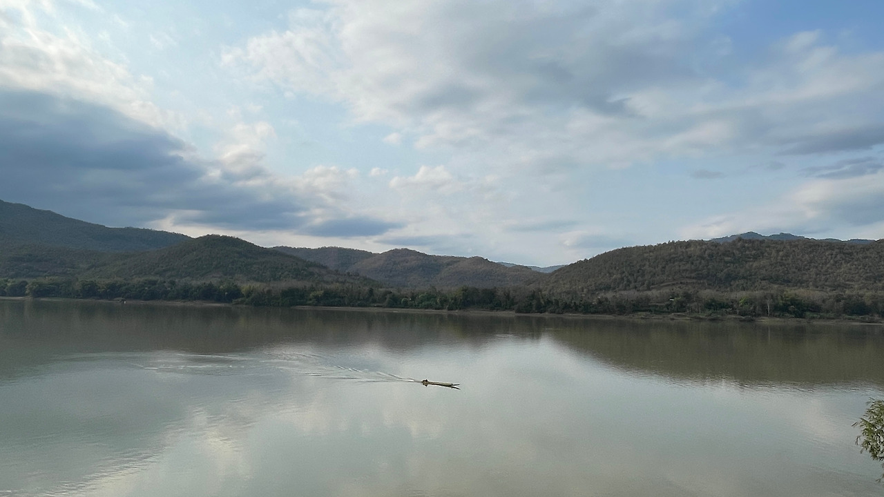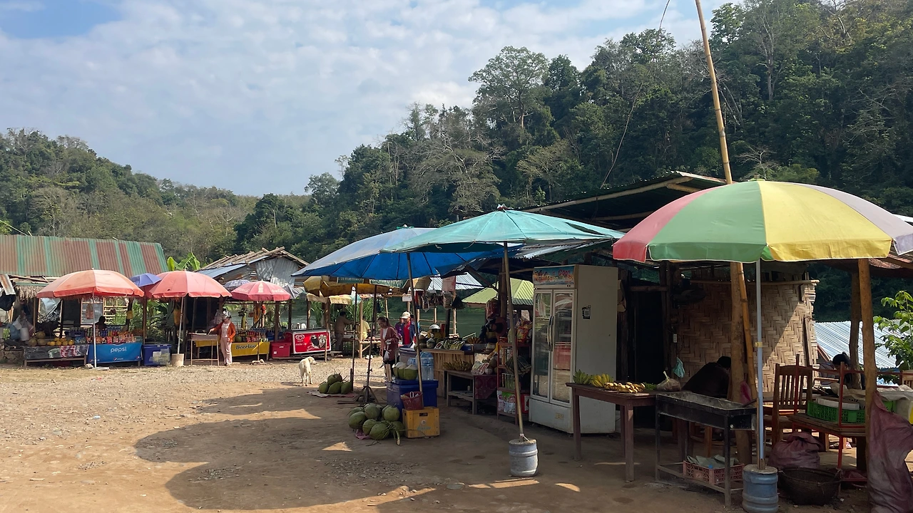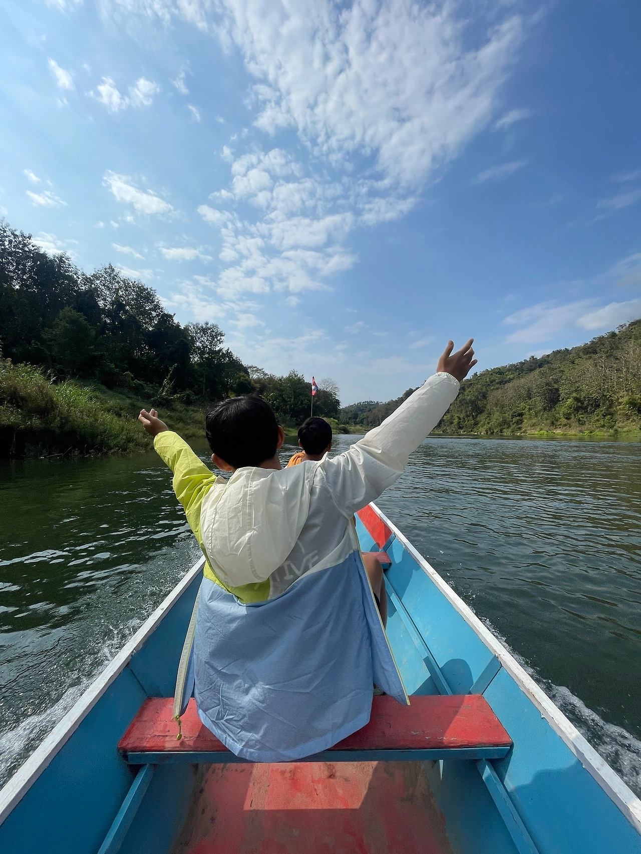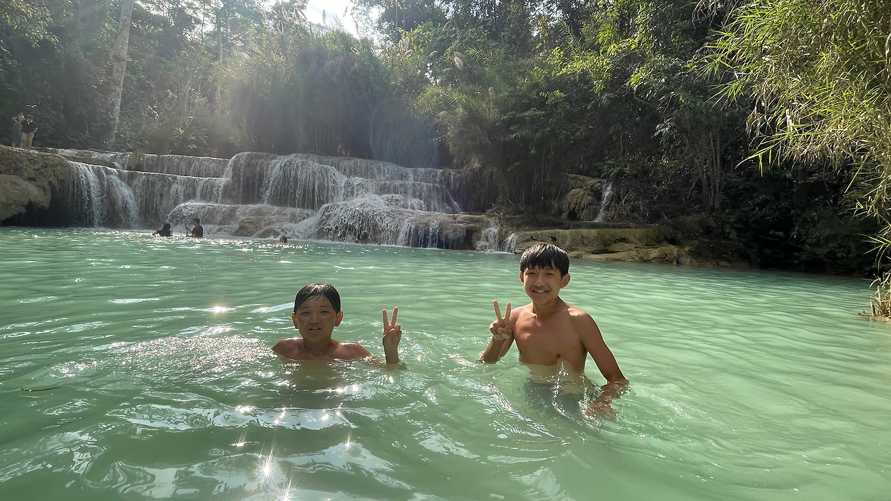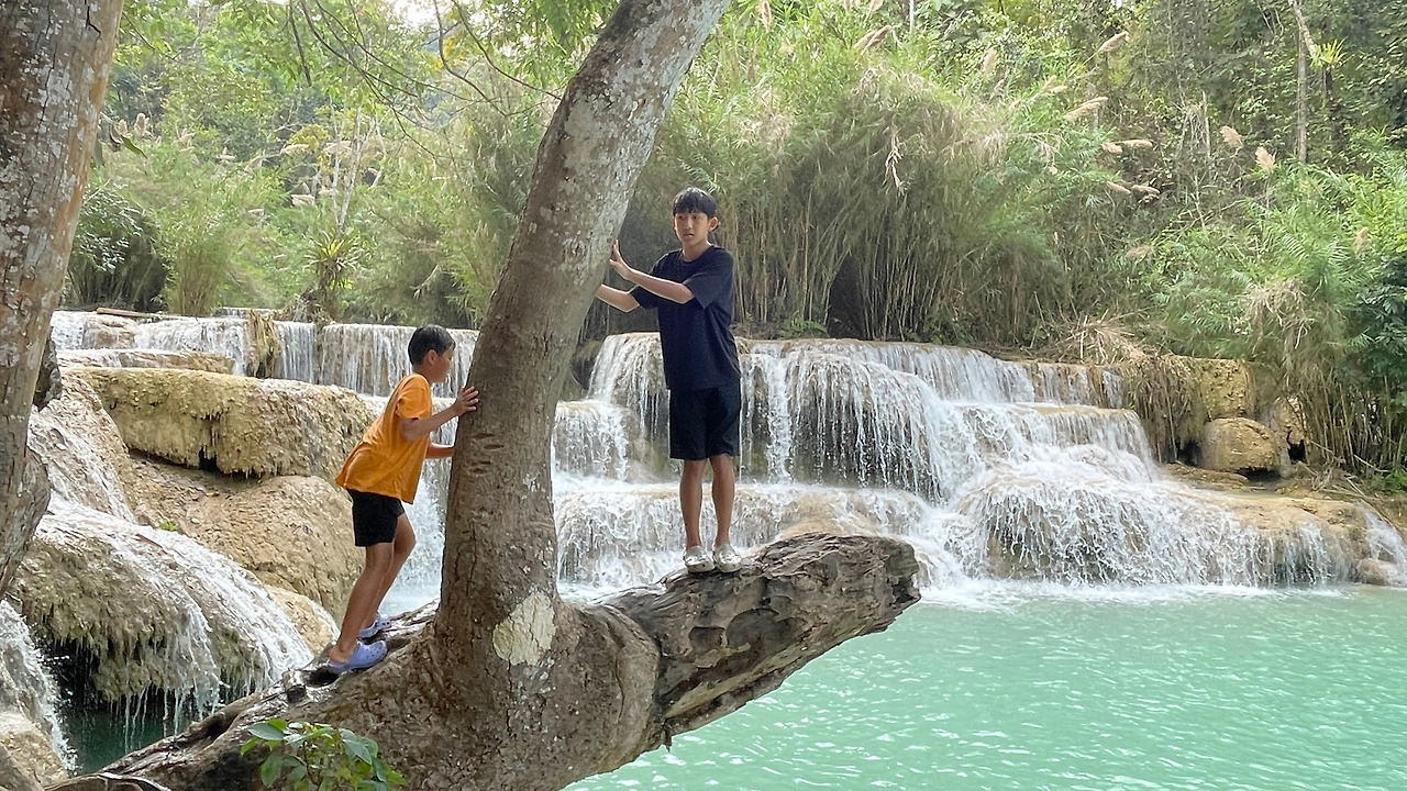 아침 식사를 마치고 오토바이에 올랐다. 큰 아들은 뒤에, 작은 아들은 앞에 탑승하는 것이 국룰이다. 아침 온도가 15도 정도라 아이들에게 봄 재킷을 입히고 아침 공기를 가르며 숲 속을 뚫고 달렸다. 라오스의 도로는 군데군데 파인곳이 있어 무작정 달리다간 사고가 나기 십상이다. 15km 거리를 30분 동안 안전하게 달려 땃새 폭포 선착장에 도착했다. 이 폭포에 가기 위해서는 먼저 주차를 하고 배티켓을 끊어 폭포가 있는 반대편 매표소로 모터보트를 타고 5분 정도 이동해야 한다. 배는 사람이 모이면 이동하는 시스템이었다. 우리 배는 중국인 부자 2명을 함께 태우고 강 건너 선착장으로 이동했다.