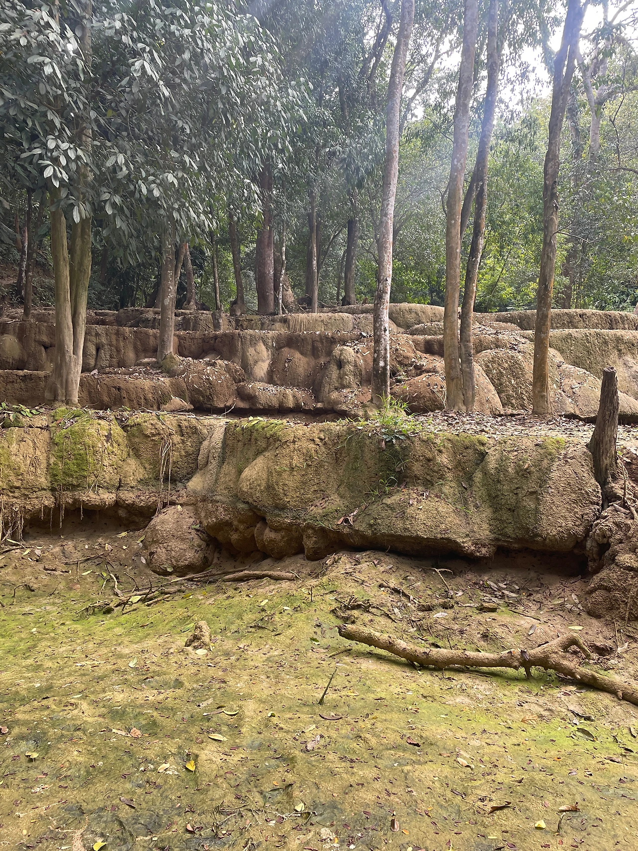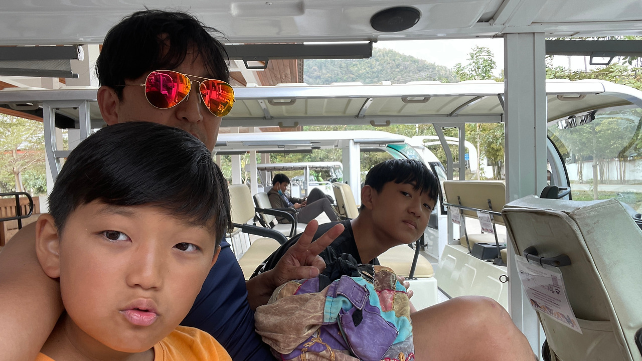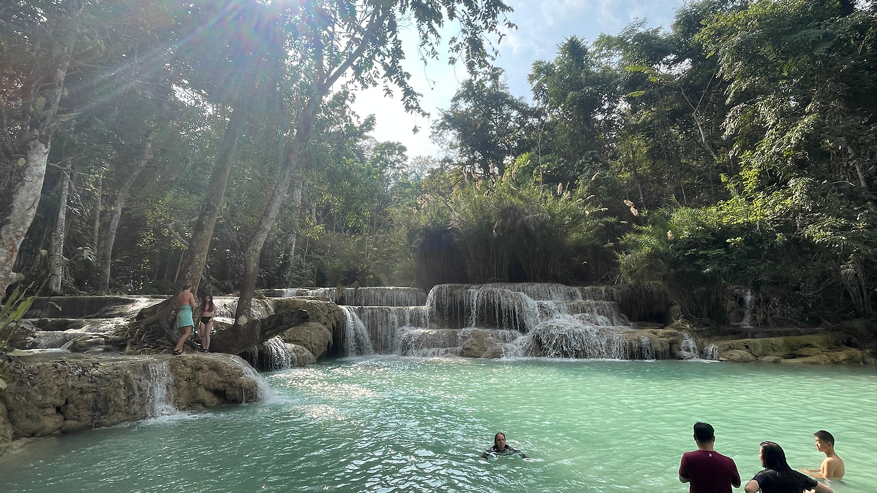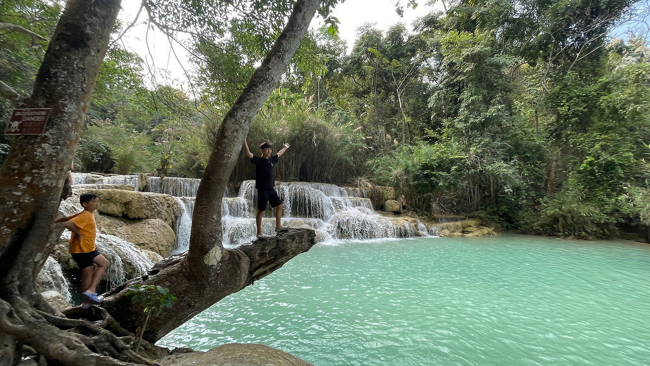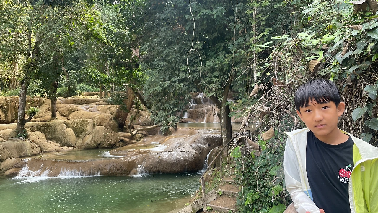 점심을 먹고 숙소로 돌아와 꽝시 폭포에서 혹시 수영을 할 수 있을까 하는 기대에 수영복을 챙겨 입어야 하지만, 어제 루앙프라방 도착 후 빨래를 맡기면서 수영복을 같이 맡겨 아이들은 속옷 없이 반바지만 입히고, 나는 수영복을 입은 채로 꽝시 폭포로 출발했다. 남자아이들이라 대충 입혀도 수영이 가능한 것은 좋다. 꽝시 폭포까지 거리는 숙소에서 31km인데 구글맵에서는 소요시간이 1시간 찍혔다. 도로 상태를 대략 집작할만했다. 초행길이라 속도를 내지 않고, 중간에 패인 도로를 피해 한 시간 걸려 꽝시 폭포 주차장에 도착했다. 주차료 5,000낍에 오토바이를 주차하고, 인당 25,000낍에 입장료를 냈다. 입장권은 입장료와 함께 폭포입구까지 전기카트를 탈 수 있는 역할도 했다. 드디어 전기카트를 타고 3분여를 달리니 폭포 입구에 도착했고, 걸어서 폭포까지 이동해야 한다. 중간에 곰을 관리하는 보호소 같은 곳을 지나 가장 크고 화려하다는 두 번째 폭포에 도착했다.