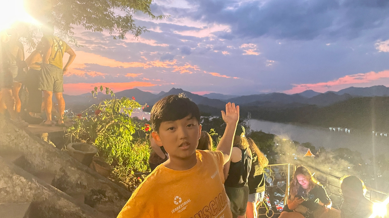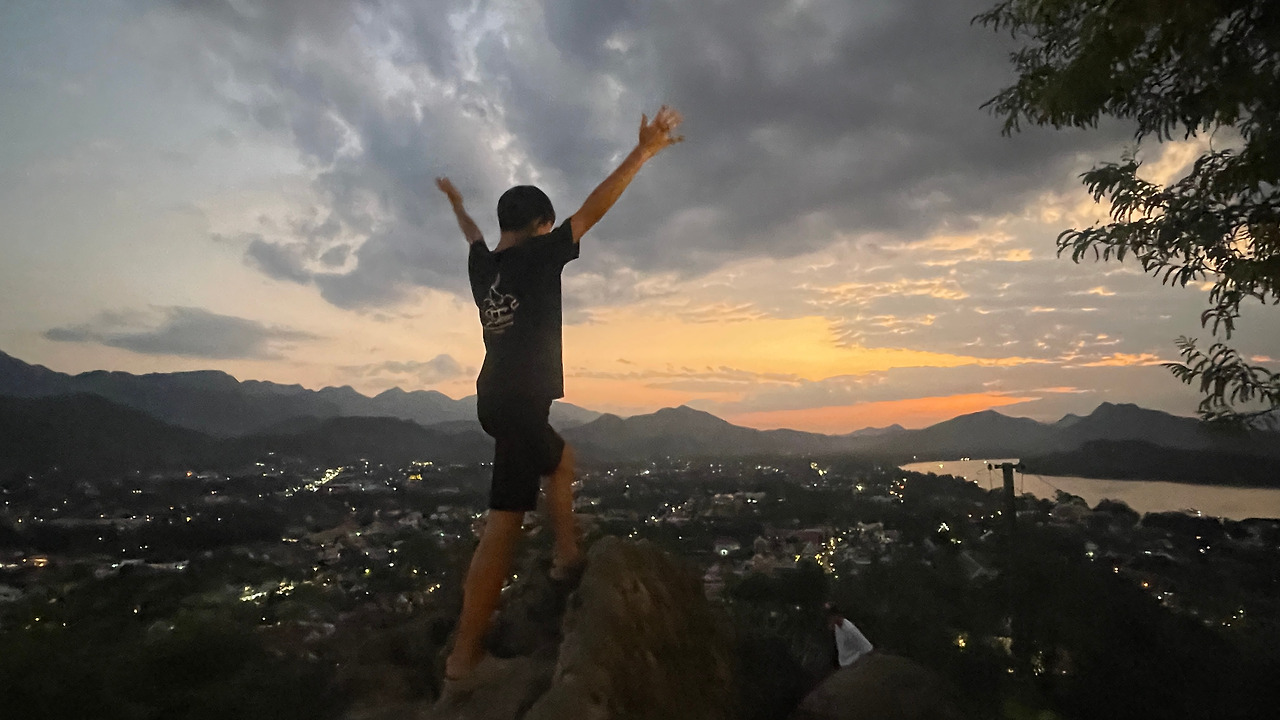 숙소에는 도착하기 전 사전에 문자를 통해 오토바이 렌트에 대해 문의해서 체크인 후 바로 렌트를 할 수 있었다. 짐을 풀고 일몰 시간이 다 되어 일단 석양을 보기 위해 주유소에서 기름을 가득 채우고 아이들을 태우고 푸시산으로 올랐다. 석양 시간엔 다소 늦었지만 아직 석양을 즐기기엔 하늘이 충분 석양을 담고 있었다. 10여 년 전 방문했을 때도 푸시산에서 메콩강을 바라보며 사진을 찍었는데, 아이들에게도 석양을 배경으로 사진을 찍어주니 10년 전 그때의 기억이 스쳐 지나갔다.