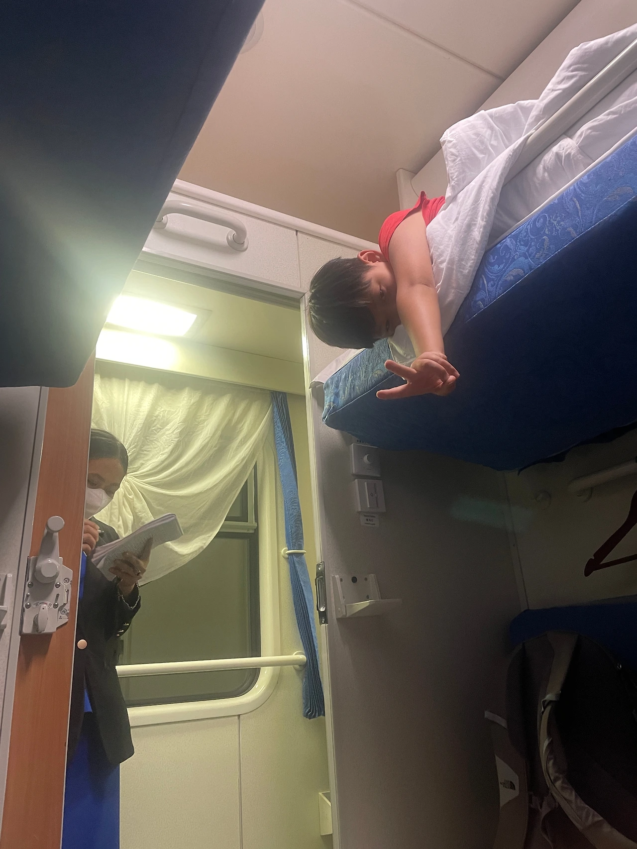 아이들은 침대 기차를 안 타봐서 침대칸으로 예약을 했다. 비록 한 시간 조금 넘게 가는 거지만 이런 기차도 있구나 경험해 보는 게 좋을 듯하여 선택했다. 1실에 4명이 타는데 우리 셋만 타고 이동했다. 1시간이 조금 넘어 우리 기차는 라오스 두 번째 도시 방비엥 역에 도착했다.