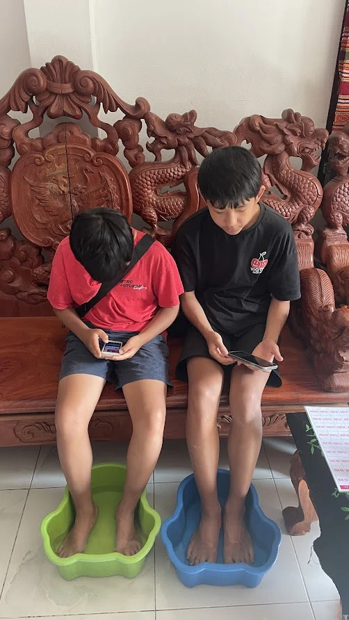 공원에 위치한 식당에는 벌써 몇몇 서양여행객 가족들이 차를 마시고 있었고, 몇몇은 오토바이를 타고 떠나고 있었다. 올라오는 길에 마을이 있었는데 이직 비포장 길을 따라 이동하면 얼마나 불편한지 몸소 겪어보니 그들의 삶이 더 대단하게 느껴졌다. 한 시간 정도를 머무르고 오토바이를 달려 다시 시내로 돌아왔다. 첫날 가득 채운 기름도 이제 절반 이하로 떨어졌다. 시내에서 BBQ와 쌀국수로 점심을 먹었는데 아직 기차 타러 갈 시간은 2시간 이상 남았다. 그래서 아이들과 함께 마사지를 받으러 갔다. 마사지라는 것이 같은 마사지사에게 받아도 사람마다 다르기 때문에 난 그냥 평점 좋고 싼 곳을 선택하는 편이다. 찾아간 마사지 샵 입구에 신발이 많이 있는 거 보니 벌써 많은 손님이 마사지를 받고 있는 듯했다. 아이들은 이 틈을 이용해 게임을 한다고 발 마사지를 선택하고, 나는 오토바이 라이딩으로 그을린 피부를 진정시킨다는 명목으로 오일 마사지를 선택했다.