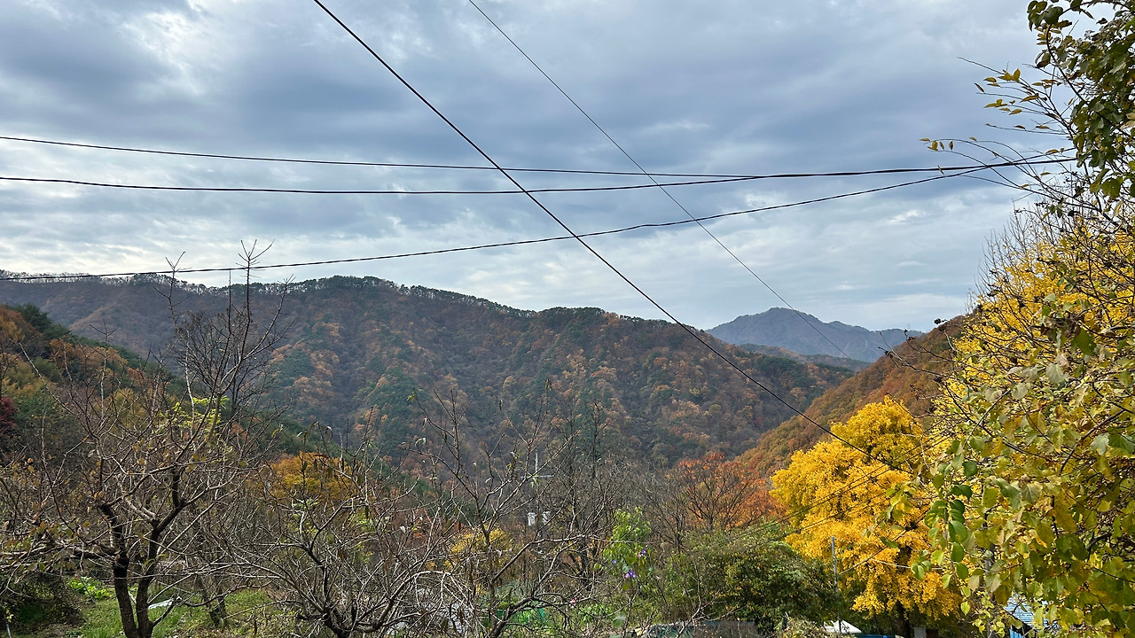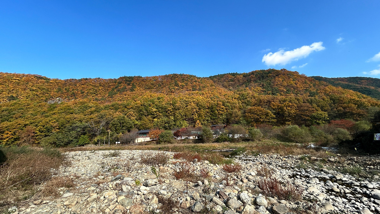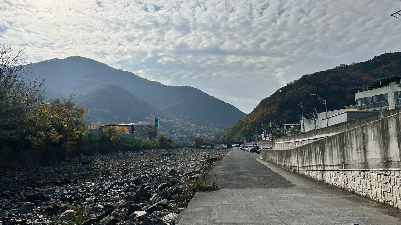 가창댐에 잠시 정차하고 ‘신천의 발원지를 찾아서’ 인트로 영상을 찍고 남은 커피 한 잔을 마시며 가을로 물든 만수위의 가창댐을 바라보았다. 오늘의 첫 번째 목적지는 두 개의 발원지중 하나인 가창댐으로 흘러드는 용계천 상류를 방문하고, 두 번째 목적지는 가창면 우록리 상류 지역에 위치한 ‘방치재(밤티재)’ 발원지를 방문하는 것이다. 첫 번째 목적지는 잘 닦여진 도로를 따라가다 보면 나오는 ‘가창 2’ 버스의 회차지에서 앞산 쪽으로 올라가는 곳에 위치한다. 가는 길에 봄에 들렀던 조방길 가옥이 있어 산속 깊숙한 가을을 느끼기 위해 잠시 들르기로 했다. 헐티재를 향해 해발고도를 높일수록 붉게 물든 노을과 같은 산들이 형형색색 나타났다.