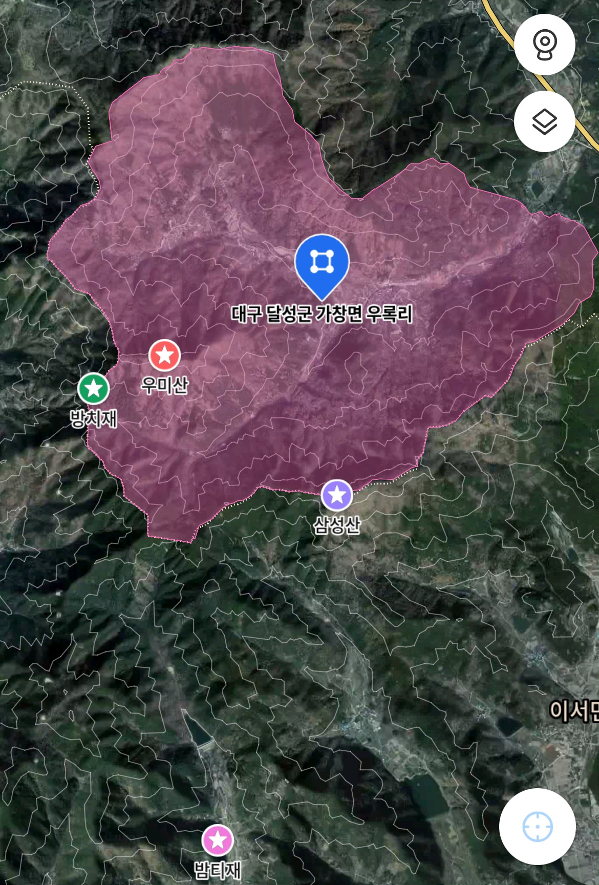 즉, 가창면 우록리를 기준으로 청도군 각분면 쪽, 우미산으로 넘어가는 고개가 ‘방치재’이며, 남쪽 삼성산을 통해 청도군 이서면으로 넘어가는 고개가 ‘밤티재‘이다.