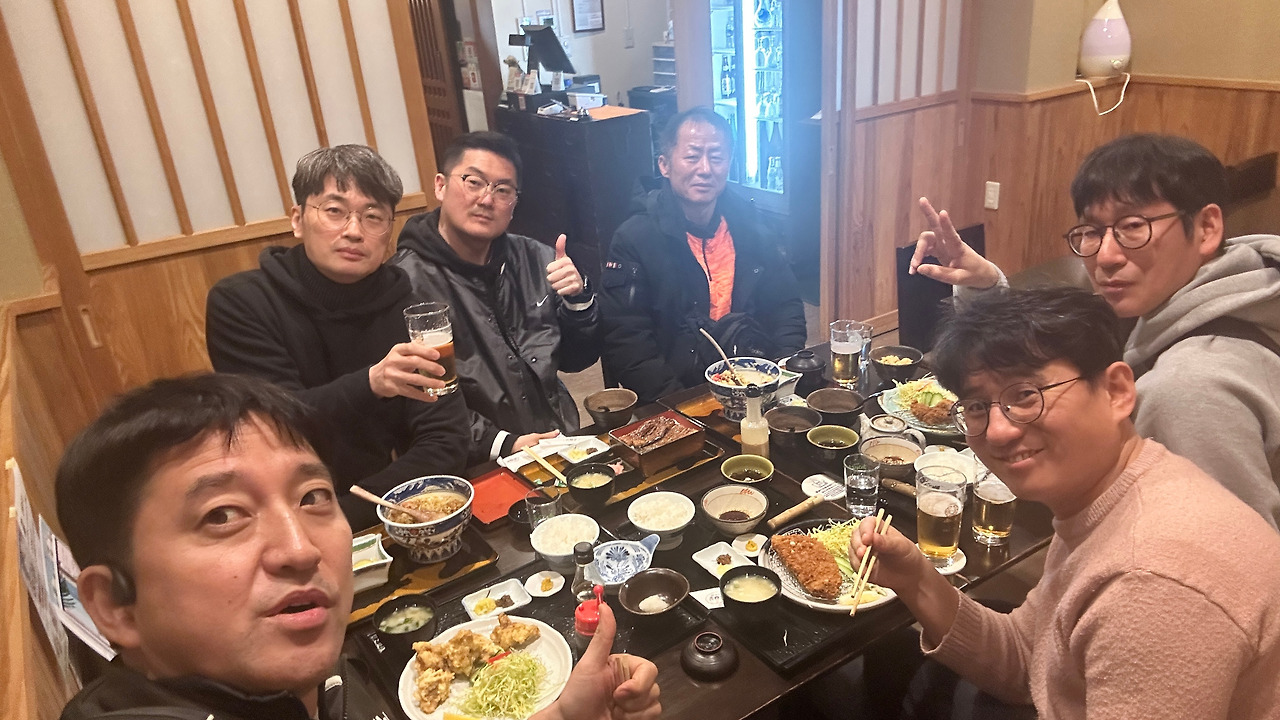사설 주차장에 주차를 하고 후쿠오카 공항으로 향하는 비행기를 타고 한 시간이 안되어 일본에 내려 hi hi렌터카에 예약한 8인승 차량에 6명이 타고 답사 겸 여행을 시작했다. 물론 일본 입국과정에서 우리의 홍영감님께서 4번의 입국거절의 에피소드로 큰 즐거움을 줬으나 더 이상 입에 담지 않기로 하고, 렌터카 업체 앞 라멘집에서 돈카츠 라멘(?)을 먹고 가장 장거리 이동인 이부스키까지 곧바로 이동했다. 저녁은 이부스키에서 유명한 흑돼지요리를 하는 향토 음식점에서 6개의 메뉴를 나눠서 든든하게 저녁을 해결했다.