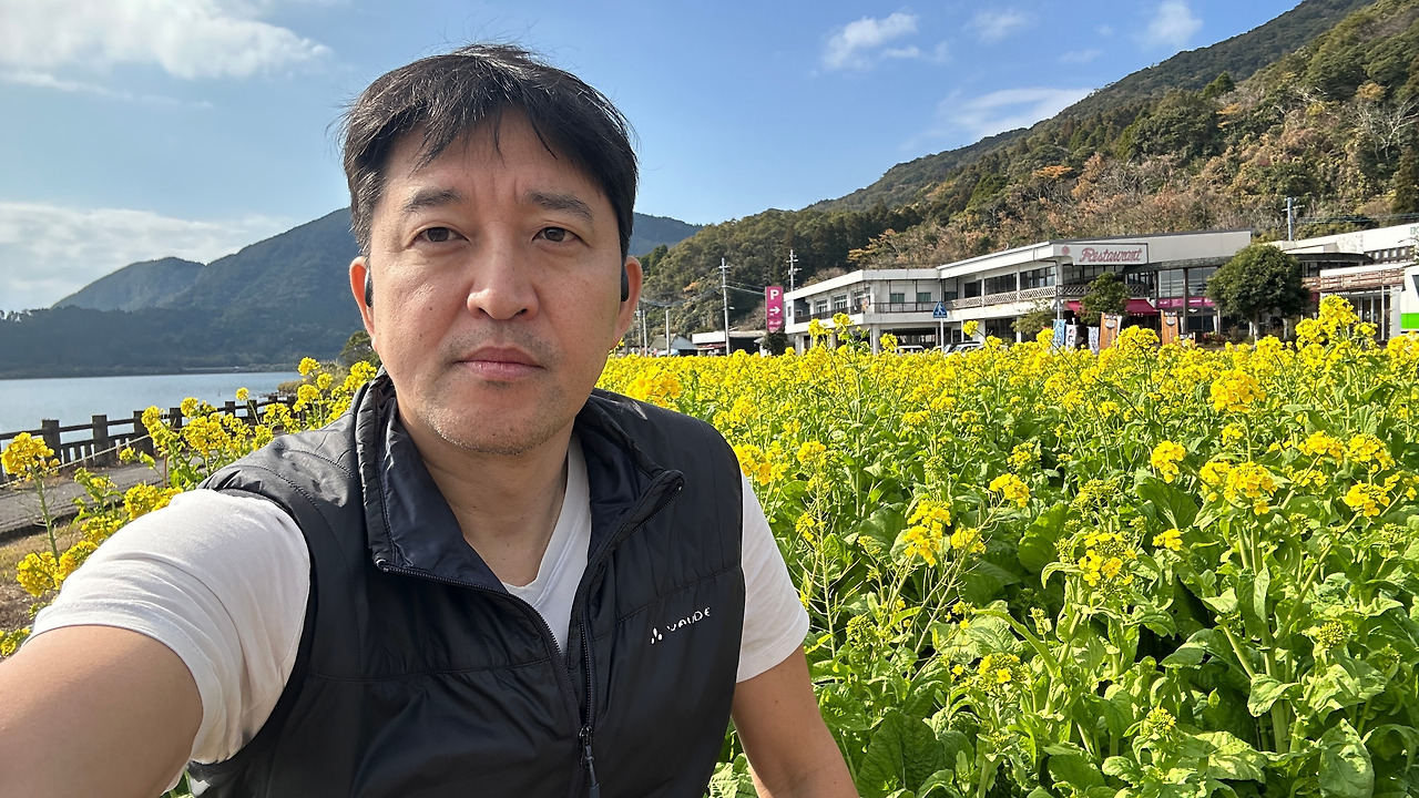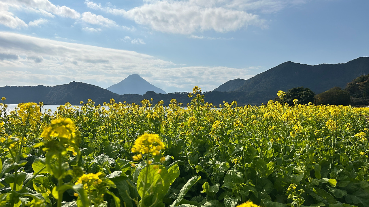 나가사키바나로 발음되는 장기곶에서 가이몬산을 배경으로 사진을 찍고 화산암의 해변을 거닐다가 차로 돌아와 이케다 호수를 돌면서 가고시마로 가는 길에 유채꽃 밭이 있어 한 겨울에 봄을 만끽했다. 만발한 유채꽃에서는 생명력 강한 향기가 뿜어져 나오고 있었다.