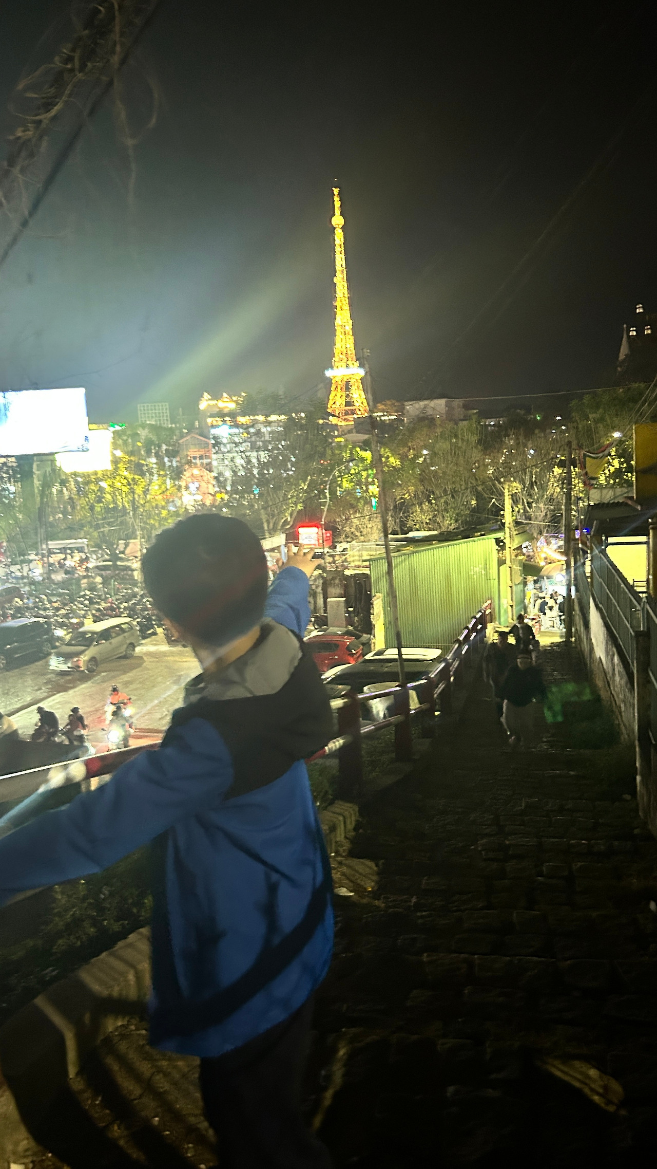 첫 포인트 관람을 마치고 야시장 쪽으로 이동을 했다. 사전에 찾아 놓은 수많은 맛집들은 시간과 동선이 꼬이며 모두 탈락하고 야시장 가는 작은 골목의 현지인들 식당에서 쌀국수로 저녁을 먹었다. 둘째는 안 먹겠다 해서 3개만 시켰는데, 결국 엄마 쌀국수를 혼자 다 먹어버렸다. 야시장에 도착해서 한 바퀴 돌고 숙소로 가는 길에 맥주를 한 잔 하려 했지만 뗏(베트남 설) 기간이라 문을 연 가게기 보이지 않았다. 밤에만 아름다운 송신탑을 배경으로 사진을 찍고 숙소에 도착했다.