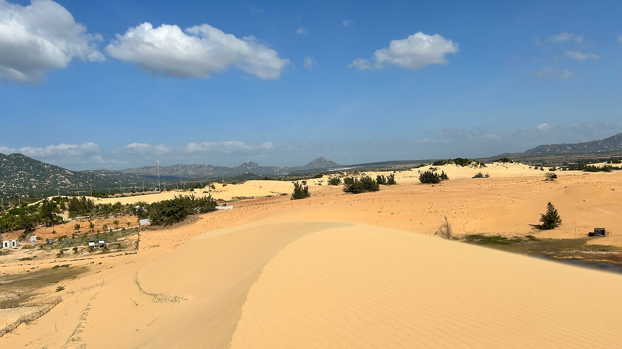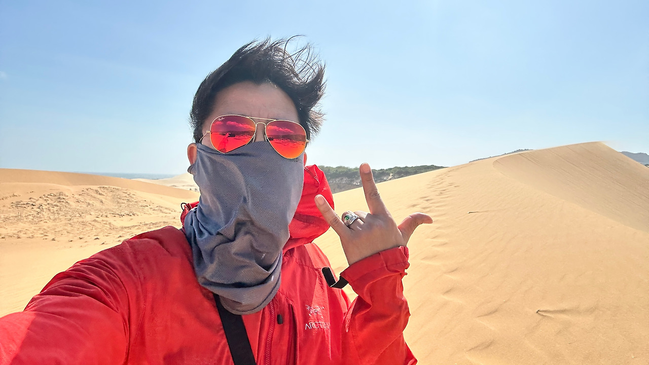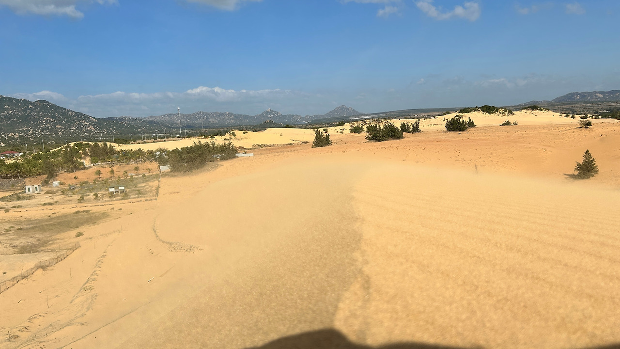 깜란 공항을 지나 깜란 지역 시내를 통과하니 첫날 달랏으로 갔던 길들이 떠 올랐다. 가면서는 쉬지 않고 달렸고 중간에 주유를 한 번했다. 기름통이 적은 지 2.5리터 (5.5만 동) 정도밖에 들어가지 않았다. 판랑탑짬은 닌투언성의 성도인데 도착해서 구글을 찾아보니 같이 뜬 사원의 모습을 보고 사원이 왜 없지 하는 바보 같은 짓을 하기도 했다. 정신을 차리고 해안 사구가 있는 포인트를 찍으니 25km 떨어져 있었다. 해안 사구의 규모를 모르는 상태에서 갔다가 실망할까 두렵기도 했지만 다시 열심히 오토바이를 달려 해안사구가 있는 곳에 도착했다. 주변으로 jeep투어나 ATV(사륜오토바이) 업체들이 도로변을 차지하고 있었지만 해안 사구로 난 골목을 따라 사구로 접근이 가능했다. 하지만 모래가 많이 쌓여 오토바이 접근이 불가능해졌고 걸어서 해안 사구 위로 올라갔다.