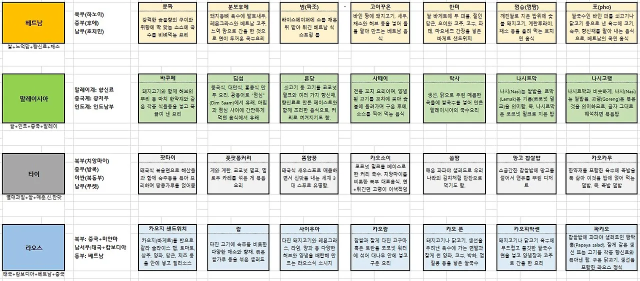 여행은 시각, 후각, 미각, 청각, 촉각 그리고 육감으로 우리의 기억 속에 저장된다. 여행에서 우리는 시각에 가장 많은 것을 의존한다. 후각, 미각, 청각, 촉각을 느끼기 전에 먼저 우리가 느끼는 것이 눈으로 보이는 것이기 때문이다. 음식도 그렇고, 성당에서 들려오는 종소리 역시 소리가 나는 쪽으로 눈을 돌려 시각도 함께 그 상황을 인식하기 때문이다. 이렇듯 시각은 여행에서 가장 중요한 요소이다. 가장 많은 정보를 처리하여 뇌에 저장하고 다양한 감각들을 돕기도 하니 말이다. 하지만 많은 일을 처리하는 시각은 또한 많은 것을 저장하지 못하고 잊히게 한다. 여행을 하고 나서 뒤 돌아보면 시각적인 것들 예를 들어 일출이나 일몰, 장엄한 자연환경, 시장에서의 사람들, 아름답게 플레이팅 되어 나오는 음식 등 기억에 담긴 많은 것들 중 또 많은 것들이 잊히기 마련이다. 뇌는 모든 것을 다 저장할 순 없으니 하나씩 하나씩 기억에서 잊혀 결국에는 시각, 미각에 관련된 기억이 비슷한 수준으로 남아있게 되는 걸 볼 수 있다. 물론 사람마다 조금씩 다르겠지만 말이다. 이는 우리가 특정 여행지를 떠올릴 때, 시각적인 것과 함께 음식을 떠올리는 것을 보면 쉽게 이해할 수 있다. 예를 들어 이탈리아 하면 콜로세움과 피사의 사탑을 떠올림과 동시에 피자와 파스타를 떠 올리 듯이 말이다. 물론 캄보디아처럼 앙코르와트는 떠오르지만, 대표적인 음식은 떠오르지 않는 경우도 있고, 베트남처럼 시각적인 관광지보다 Pho(쌀국수)가 먼저 떠오르는 경우도 있다. 그래서 이번 주제는 지역별 대표 음식에 대해 한눈에 들어오도록 파악해 보기로 한다.