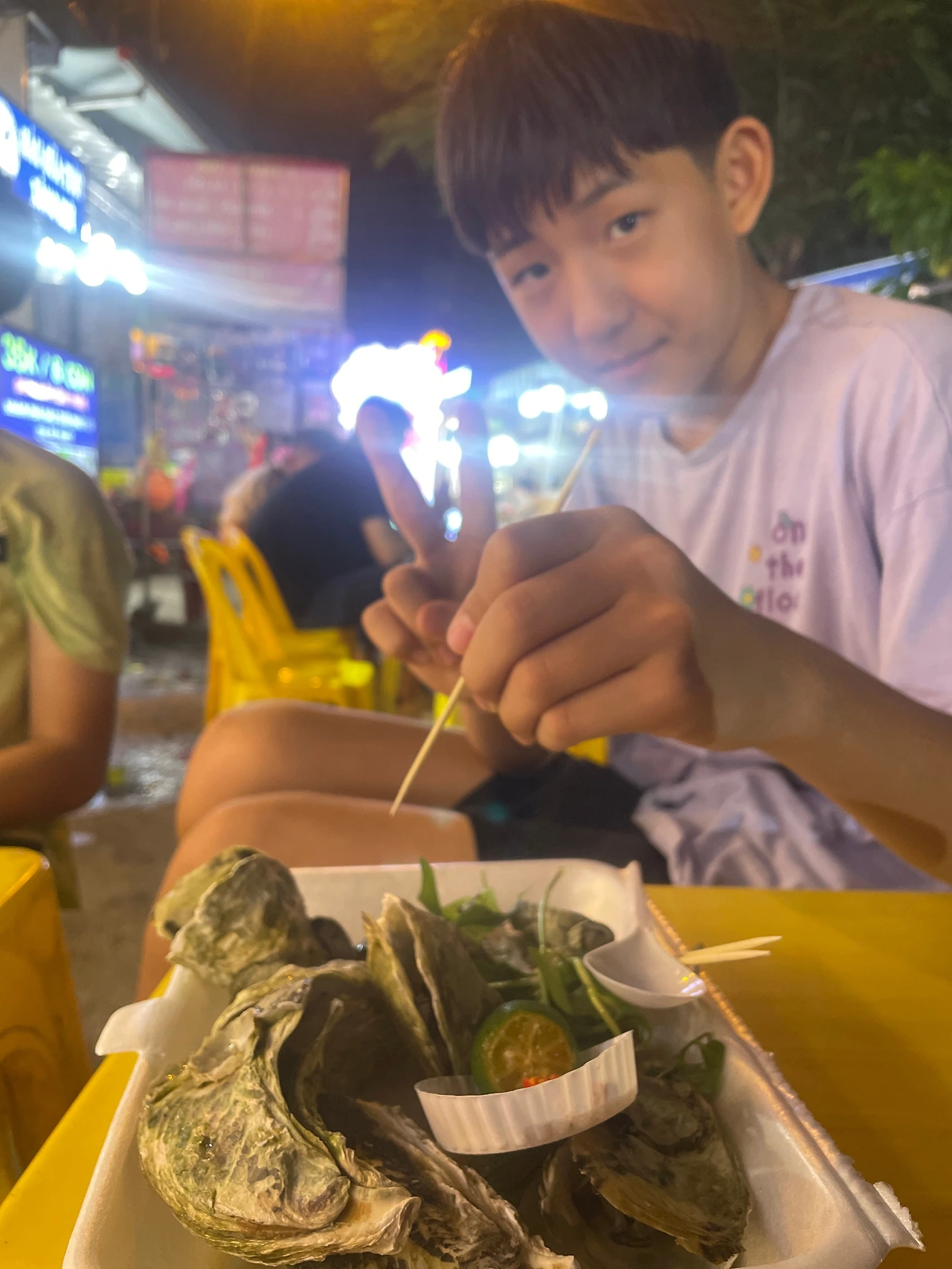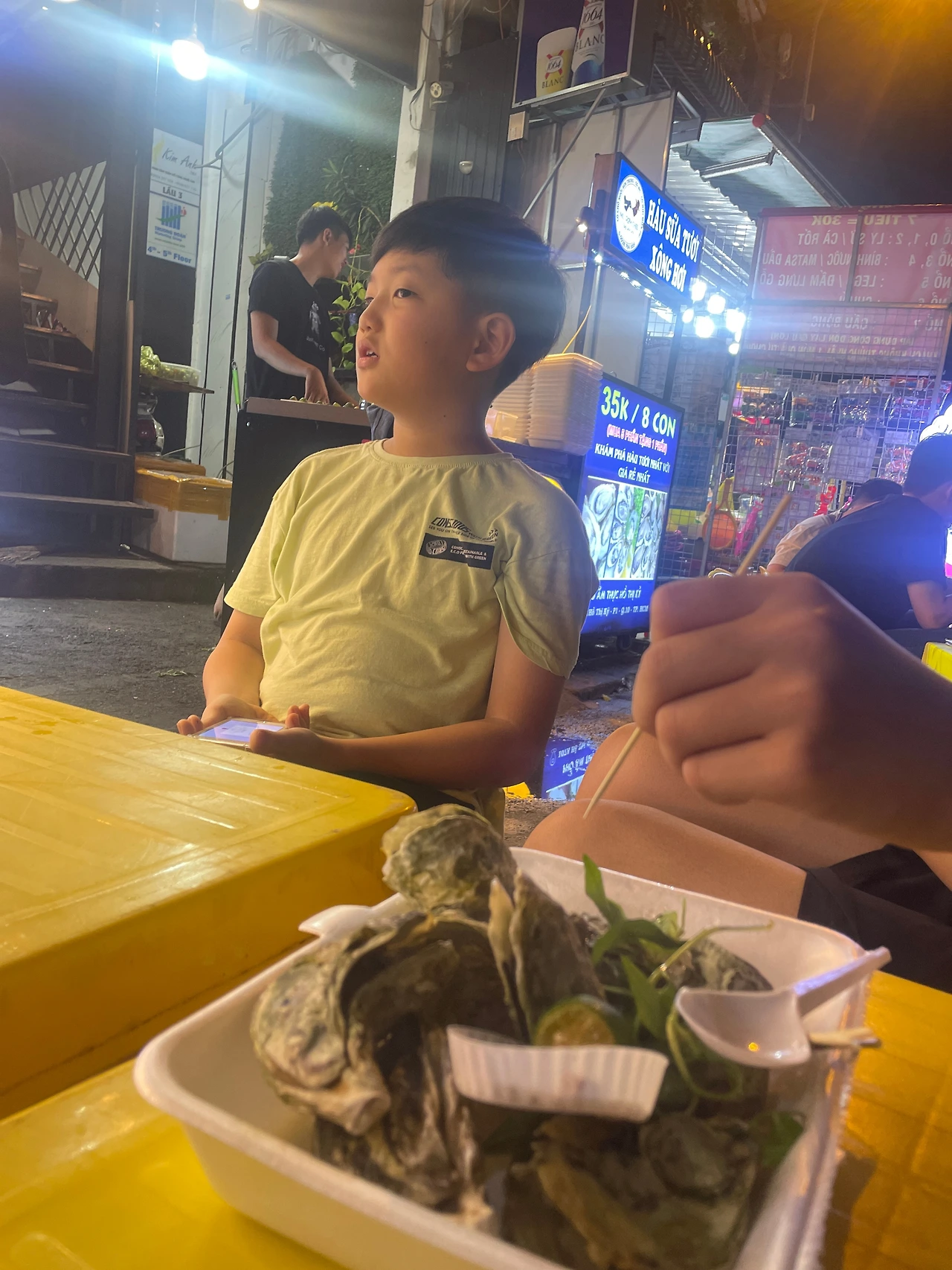 점심식사는 음료가 불포함이지만 투어비용에 점심식사는 포함되어 있다. 시원하누맥주를 두 캔 시켜 점심식사도 만족스럽게 잘했고, 아이들도 점심을 맛있게 먹고 여행일정에 튀지 않고 잘 적응하며 따라 주었다. 여행을 마치고 돌아오는 버스에서 아빠는 체력이 다해 늘어져 잤지만 아이들은 역시 에너자이저의 체력으로 주야장천 게임 삼매경에 빠져 있었다. 앱으로 게임을 잠글까도 했지만 아이들도 여행이니 좀 즐길 수 있게 게임을 하게 해 주었다. 돌아오면서 저녁은 뭘 먹을지 대화도 나누면서 어제의 악몽이 모두 차유됐다는 생각을 하며 여행을 같이한 다국적 멤버들과 헤어지고 숙소에서 하루종일 쌓였던 피로를 샤워로 풀고 ho thi ky 야시장을 방문하기로 했다. 버스를 타고 가려다 아이들이 피곤할까 그랩을 불러 10분 만에 야시장에 도착했다. 다른 동남아 국가와 달리 호찌민의 야시장은 잘 발달하지 않은 편이고, 이곳은 현지인 위주라 큰 기대를 안고 야시장 입구에서 굴구이로 야시장 투어의 서막을 올렸다.