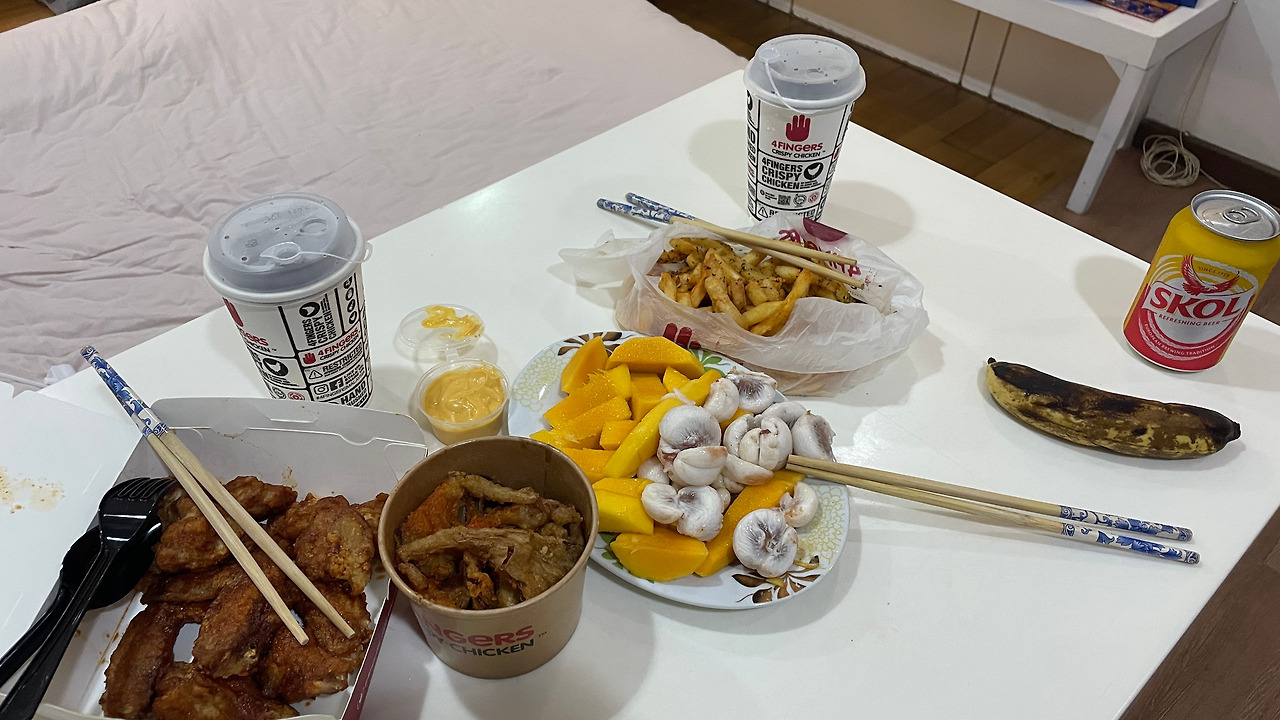 돼지 등갈비 찜 같은 것과 졸임, 공깃밥과 찍어먹는 빵을 시켜 먹고 첫째 펑크 난 수영복을 수선할 반짇고리와 간단한 음료 및 과일을 사러 숙소 쪽으로 걸어갔다.