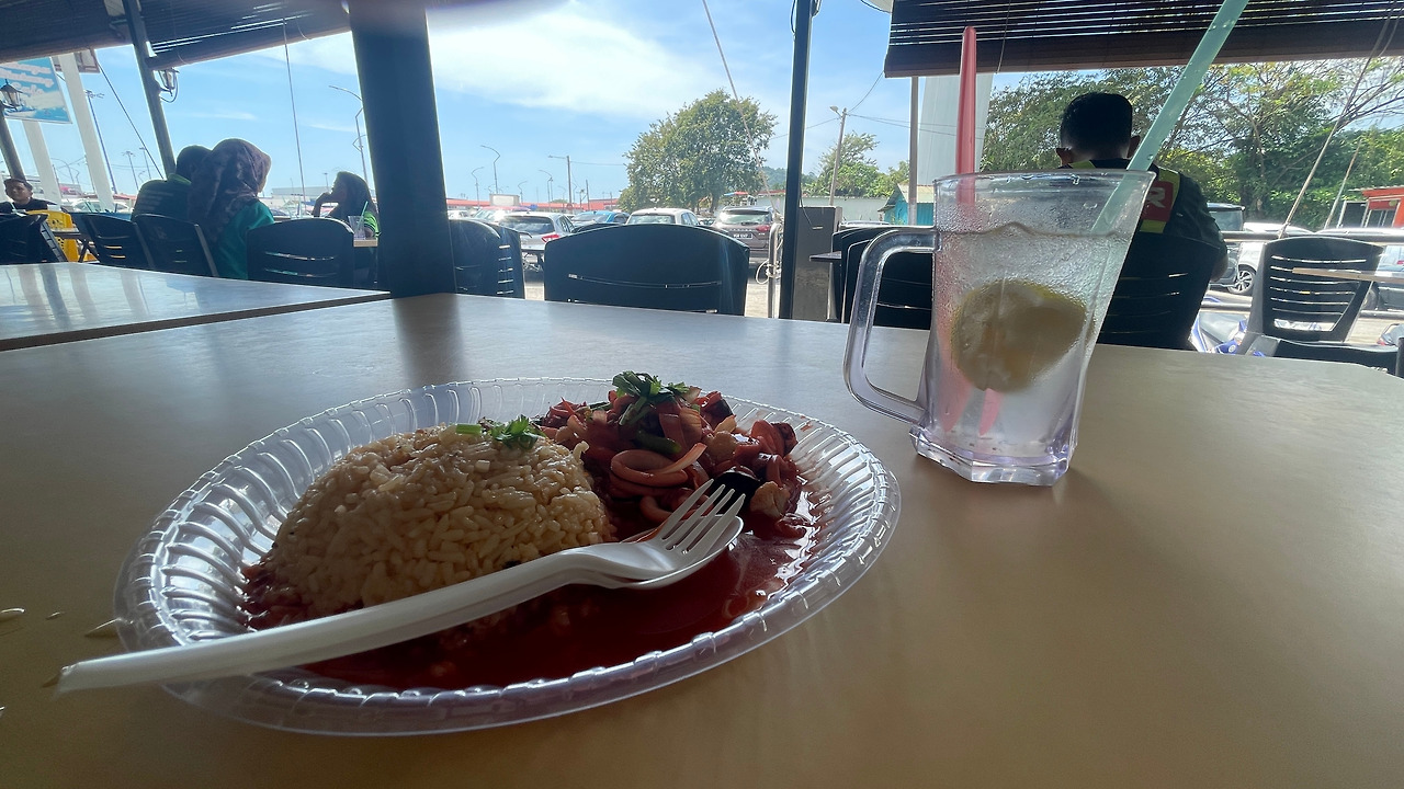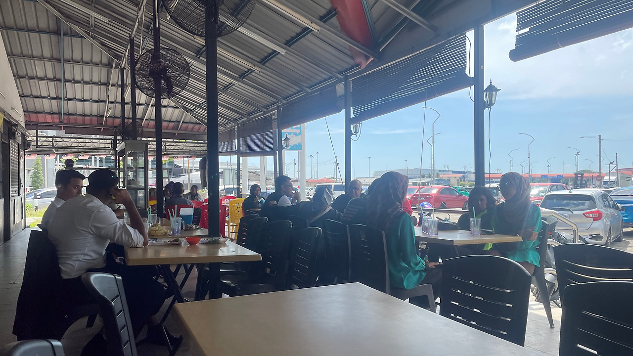 40여분을 달려 13:00에 공항에 도착했다. 아이들은 게임을 하고 17:05분 발 출발을 확인하고 아이들은 점심을 돈킨 도넛으로 먹는다고 하여 하나씩 사주고, 나는 마지막 현지식을 위해 홀로 공항 밖으로 향했다. 가는 날이 장날이라 날씨기 가장 쾌청했다. 구글로 검색하니 공항 주변에 공항직원들과 현지인들이 자주 이용한다는 식당이 있어서 홀로 걸어 식당에 도착했다. 도착한 곳은 하나의 식당이 아닌 고속도로 휴게소처럼 5-6곳의 식당이 운영되고 있었다. 마지막 식사로 나시고랭 젤 비싼 9링깃짜리와 1.8링깃 레모네이드를 주문했다. 실내는 없고 집 밑 테이블에 앉아서 먹는 체계를 갖추고 있었다.